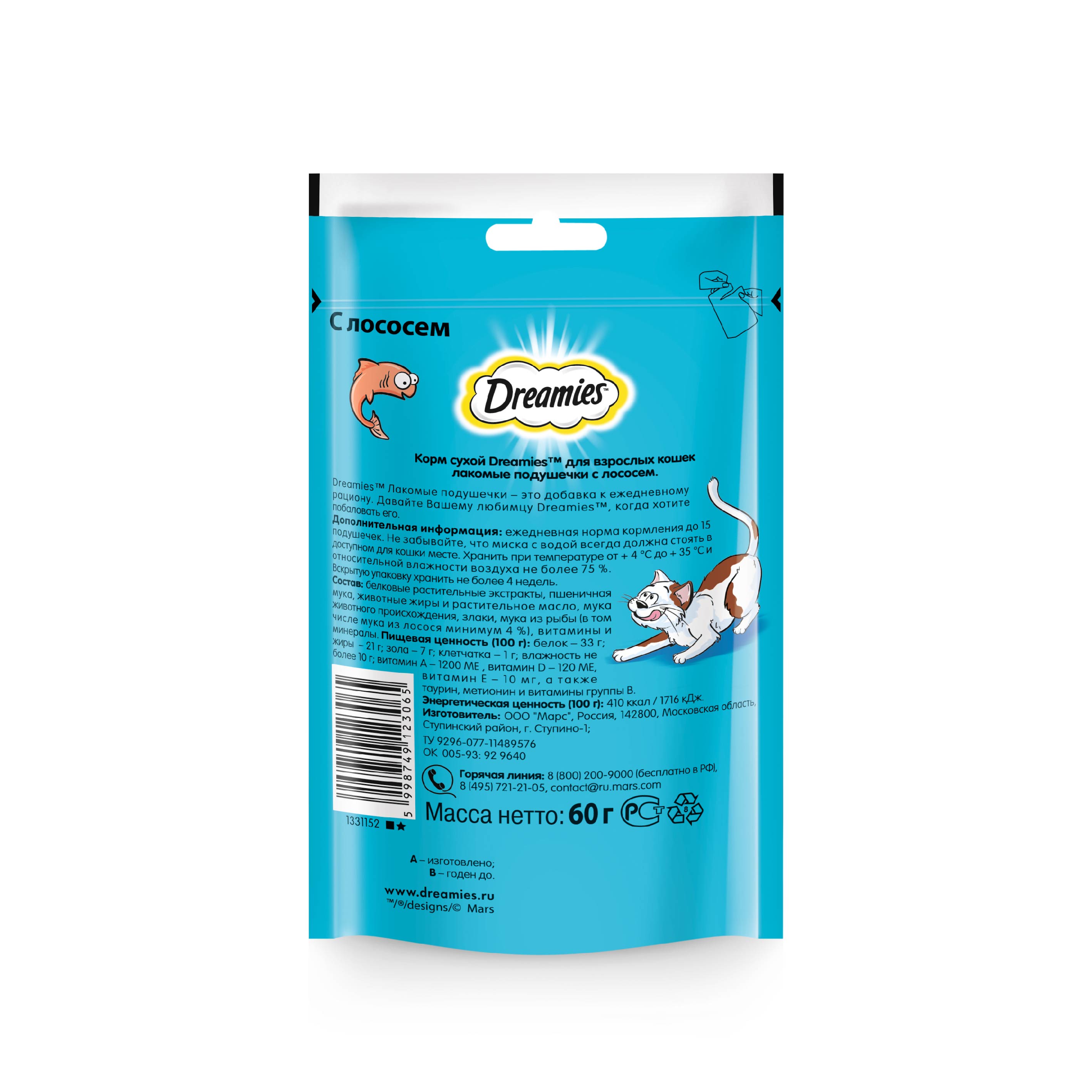 Dreamies с лососем – это лакомство, которое любят все коты на свете. Смело заводите дома аквариум, ваш усатый рыбак больше не обратит внимания на рыбок, ведь есть 30 и даже 60 грамм настоящего, нежного лосося в хрустящей подушечке. Просто рыбная сказка для вашего кота!