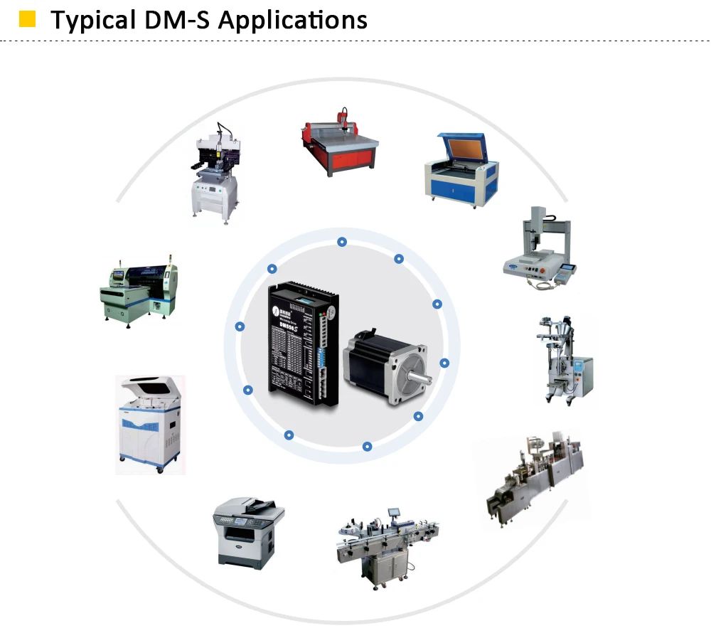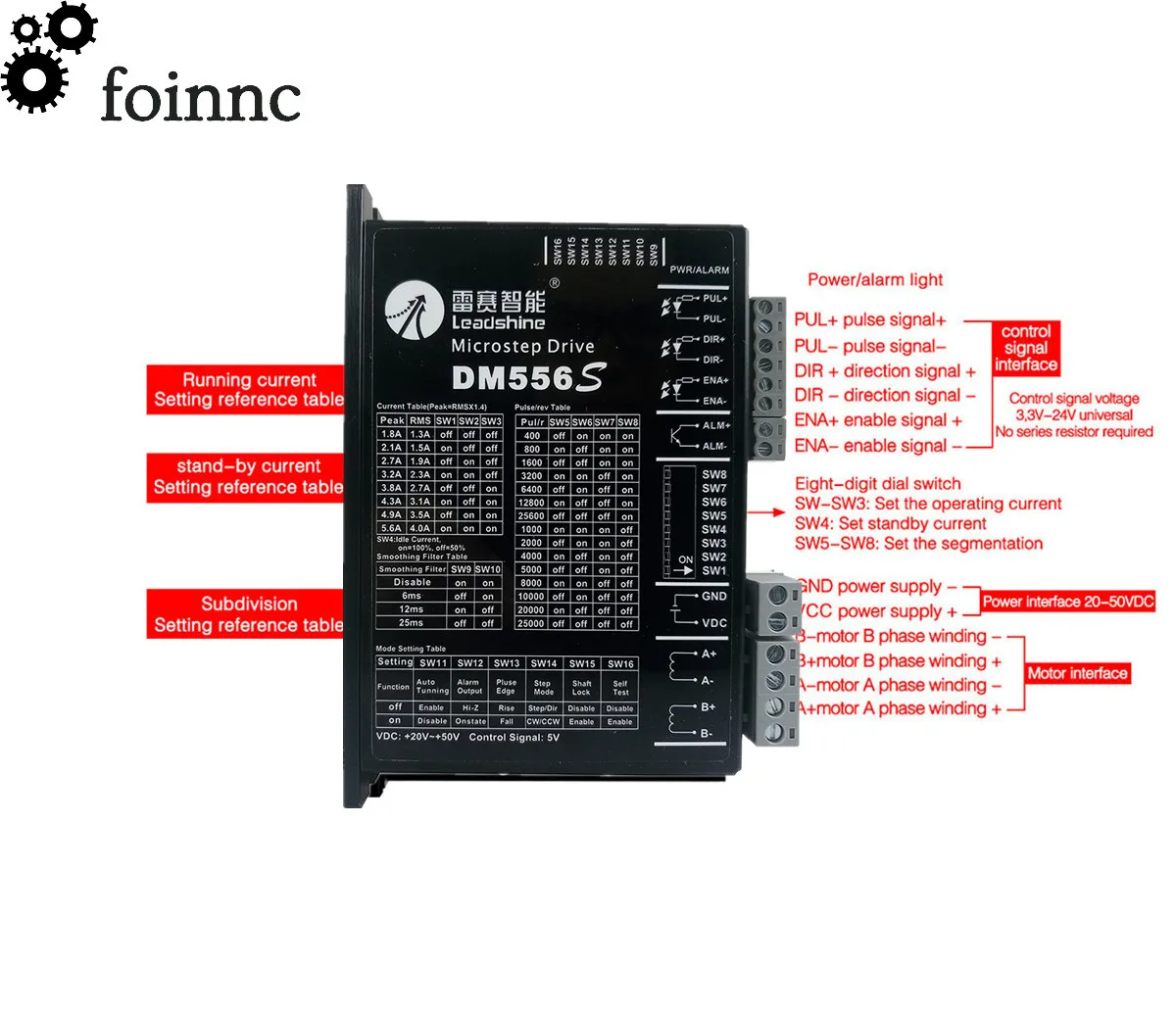 2. Особенности: Антирезонансный, обеспечивает оптимальный крутящий момент и аннулирует нестабильность среднего диапазона Самотестирование двигателя и технология автоматической настройки параметров обеспечивают оптимальное отклик при использовании различных двигателей Многошаговый вход позволяет шаговому входу с низким разрешением производить более высокий микрошаговый выход для плавной работы системы Программируемое разрешение микрошага, от полного до 102400 шагов/об Напряжение питания до + 50 В постоянного тока Программируемый выходной ток, от 0,5 А до 5,6 А Частота импульсного входа до 200 кГц TTL совместимый и оптически изолированный вход Автоматическое снижение холостого тока Подходит для 2-фазных и 4-фазных двигателей Поддержка режимов PUL/DIR и CW/CCW Защита от перенапряжения, перегрузки по току, фазовых ошибок 3. Спецификация: Модель: DM556S Мощность: 0,05-0,1 (кВт) Номинальное напряжение: 24-48 в Частота отклика скорости: 200 (кГц) Подходящий Двигатель: 42/57/86 мотор Вес: прибл. 9,5 г/унции