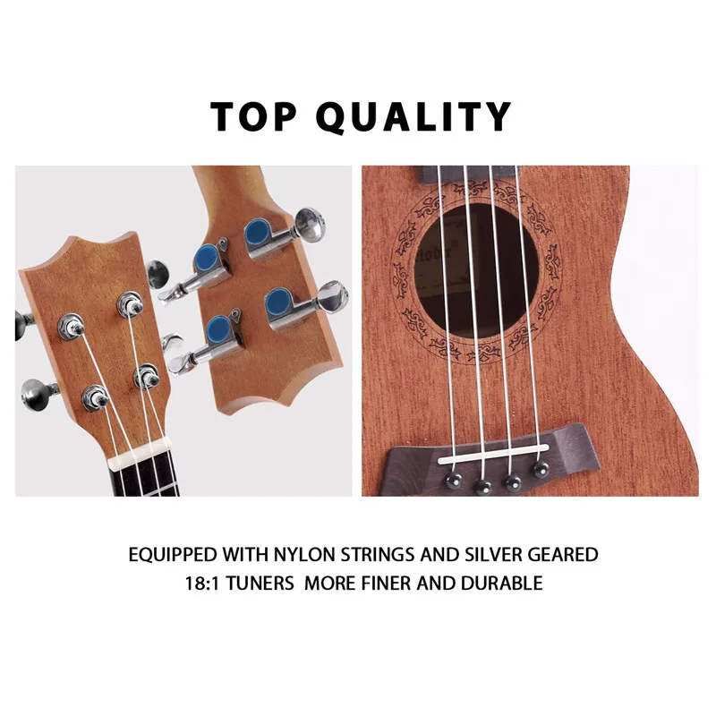 Размер: 21 дюйм с 4 нейлоновыми завязками. Материал корпуса: липа Кленовым грифом Материал: береза Тюнер: Хромированный и герметичный Гайка и седло: пластик Материал струн: нейлоновые струны Продукт Вес: 1.5lbs