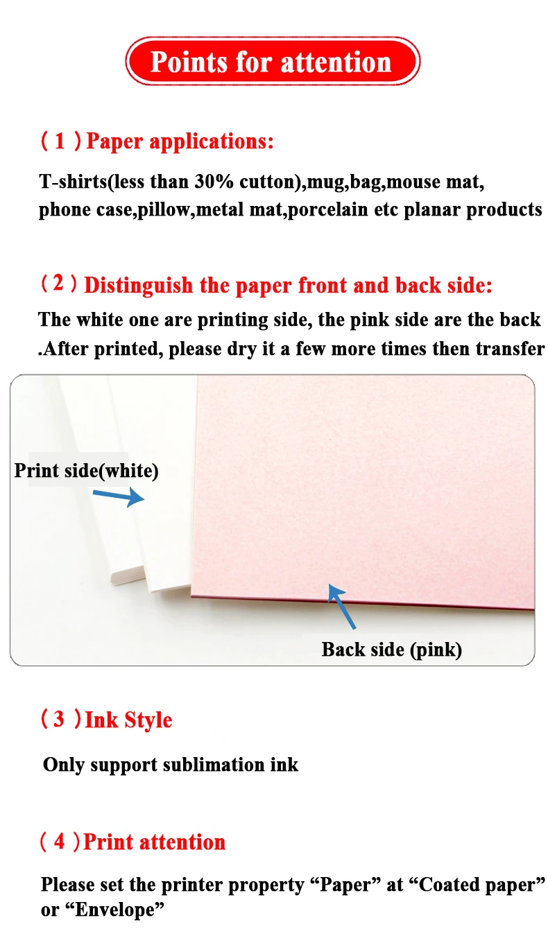 Технические характеристики: (1) Тип товара: переводная бумага; (2) Размер: A3(297 мм * 420 мм)/A4(210 мм * 297 мм) Особенности: (1) гладкая, легкая бумага для теплопередачи; (2) Используйте для персонализации вашей футболки, чашки, подушки, чехла для телефона, коврика для мыши, канцелярских принадлежностей, пазлов, шляпы; (3) быстрое высыхание и Высочайшее высвобождение чернил; (4) яркий цвет и высокая скорость передачи. Примечание: (1) Пожалуйста, используйте сублимационные чернила для печати; (2) Пожалуйста, примите некоторую погрешность для данных измерений; (3) из-за различных мониторов и различного освещения изображение может не отражать фактический цвет изделия.