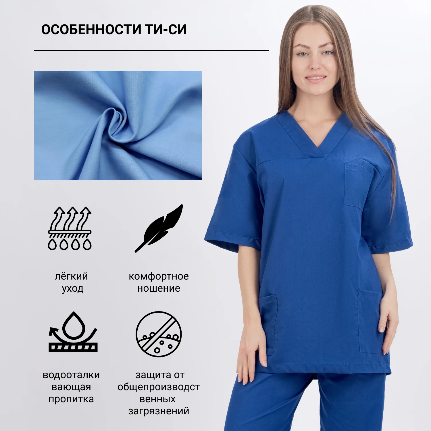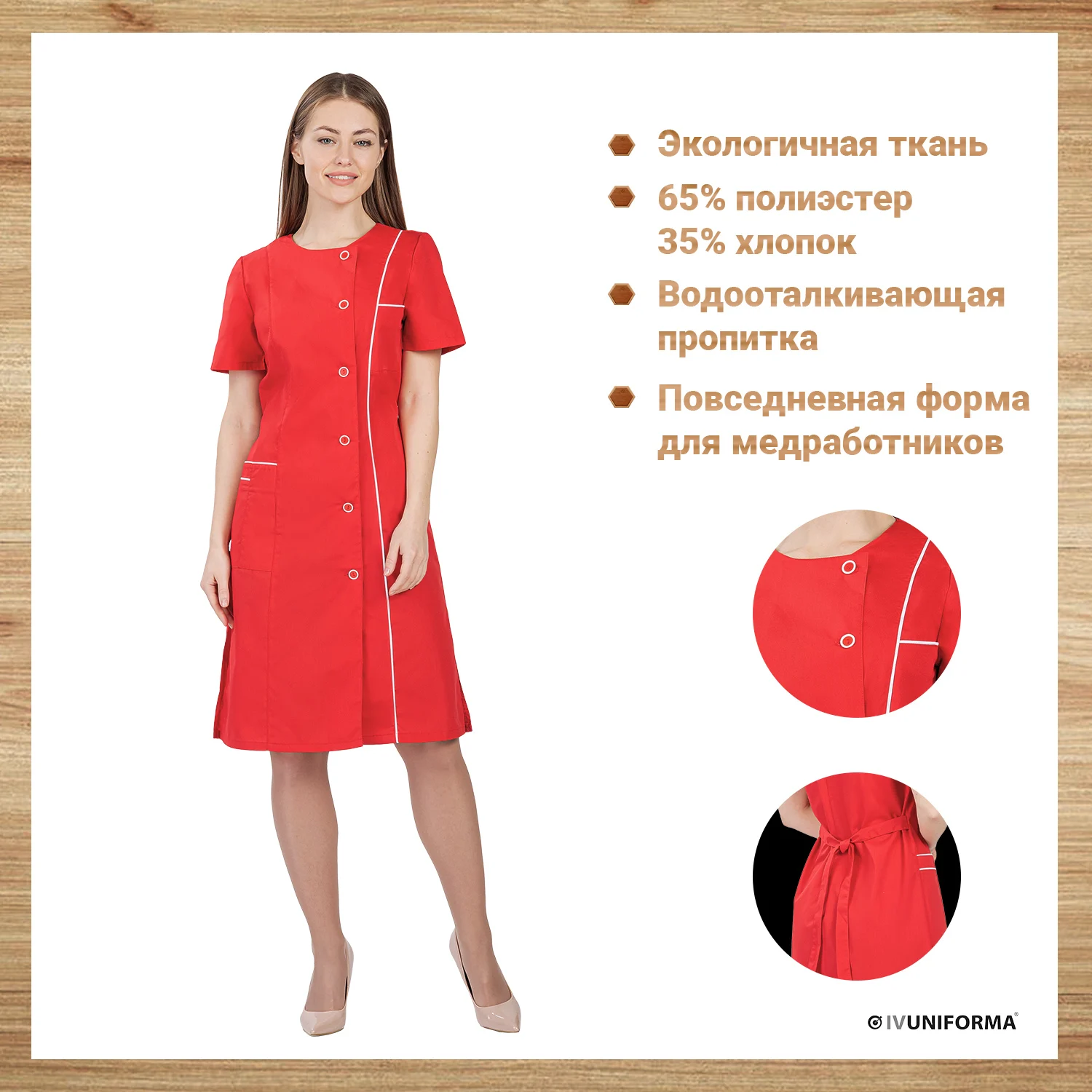 Халат медицинский женский прямого силуэта, средней длины с ассиметричной застежкой на пуговицы. Верхний срез бокового нижнего кармана, верхнего нагрудного и боковой рельеф декорированы контрастным кантом. Спинка прямая с двумя поясами для регулировки объема по талии. Рукав короткий.