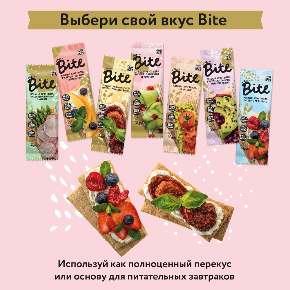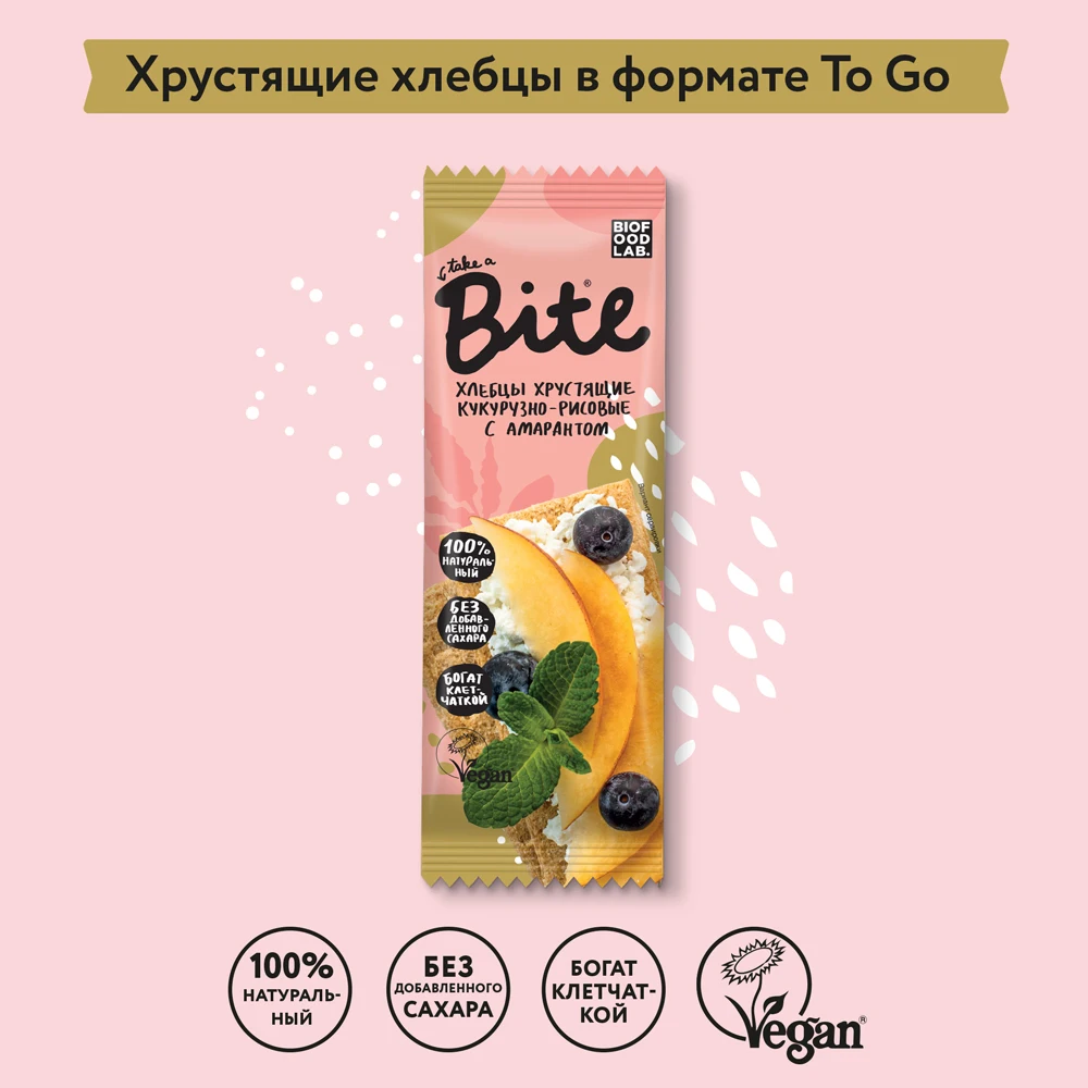 Кукурузно-рисовые хлебцы Bite с амарантом в формате ready-to-go — полезная альтернатива хлебу без глютена, сахара и дрожжей. Теперь хлебцы удобно взять с собой в офис, на тренировку или съесть всю пачку разом! Они сытные, вкусные и полезные одновременно, ведь в составе только натуральные ингредиенты. Амарант — рекордсмен по содержанию белка! В нем много витамина Е и полезных аминокислот, а в компании риса и кукурузы этот злак становится просто непобедимым. Приготовьте закуски с соевым творогом, овощами, хумусом, арахисовой пастой или съешьте их просто так — обещаем, будет вкусно, полезно и низкокалорийно!