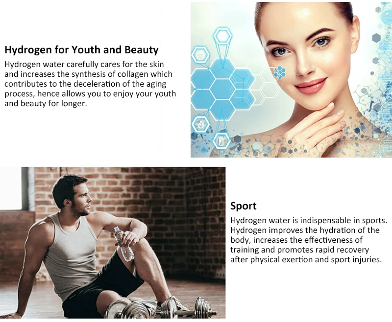 Растворенные молекулы водорода ищут самые вредные свободные радикалы в наших телах и нейтрализует их, прежде чем они могут сделать больше повреждений наших клеток. H2 дарит электрон и связи со свободным радикалом для создания молекулы, в которой наши тела нуждаются в H20 или воде. Согласно 500 научным исследованиям с 2007 года, было обнаружено, что молекулярный водород имеет большой терапевтический потенциал для лечения более 150 заболеваний. Попав в наш организм, он мгновенно начинает восстанавливать ткани и органы на клеточном уровне. Основные преимущества для здоровья: • Удалите вредные свободные радикалы из вашего организма • Улучшение здоровья и защиты клеток • Улучшает поглощение питательных веществ в организме • Лучшее увлажнение для вашего тела • Увеличение кровообращение • Помогает снизить уровень насыщенного жира • Уменьшает старение, чтобы придать коже здоровый вид • Улучшает функции мышечной ткани и подвижность суставов • Уменьшить запор проблемы • Помогает снизить уровень холестерина • Детоксикация вашего тела • Быстрое восстановление после физической тренировки • Улучшает качество жизни больных раком, проходящих медицинское лечение.
