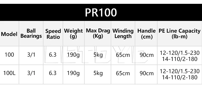 Модель: PR100 | Вес (г): 190 | Скорость передаточное число: 6,3: 1 | Макс сопротивление (кг): 5 | Упорные шариковые подшипники: 3/1 | Полиэтиленовых лески Ёмкость (lb-М):12-120/1.5-230/14-110/2-180