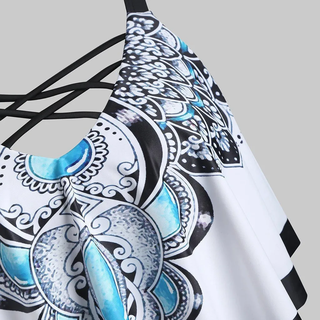 Женский купальник-танкини с пуш-ап подкладкой и принтом с оборками и перекрещивающимися полосками