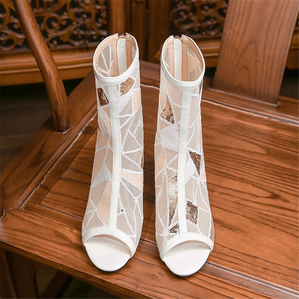 MILI-MIYA 2020 г., летние женские ботинки из сетчатого материала босоножки на тонком высоком каблуке пикантные белые туфли на молнии с открытым носком и геометрическим узором