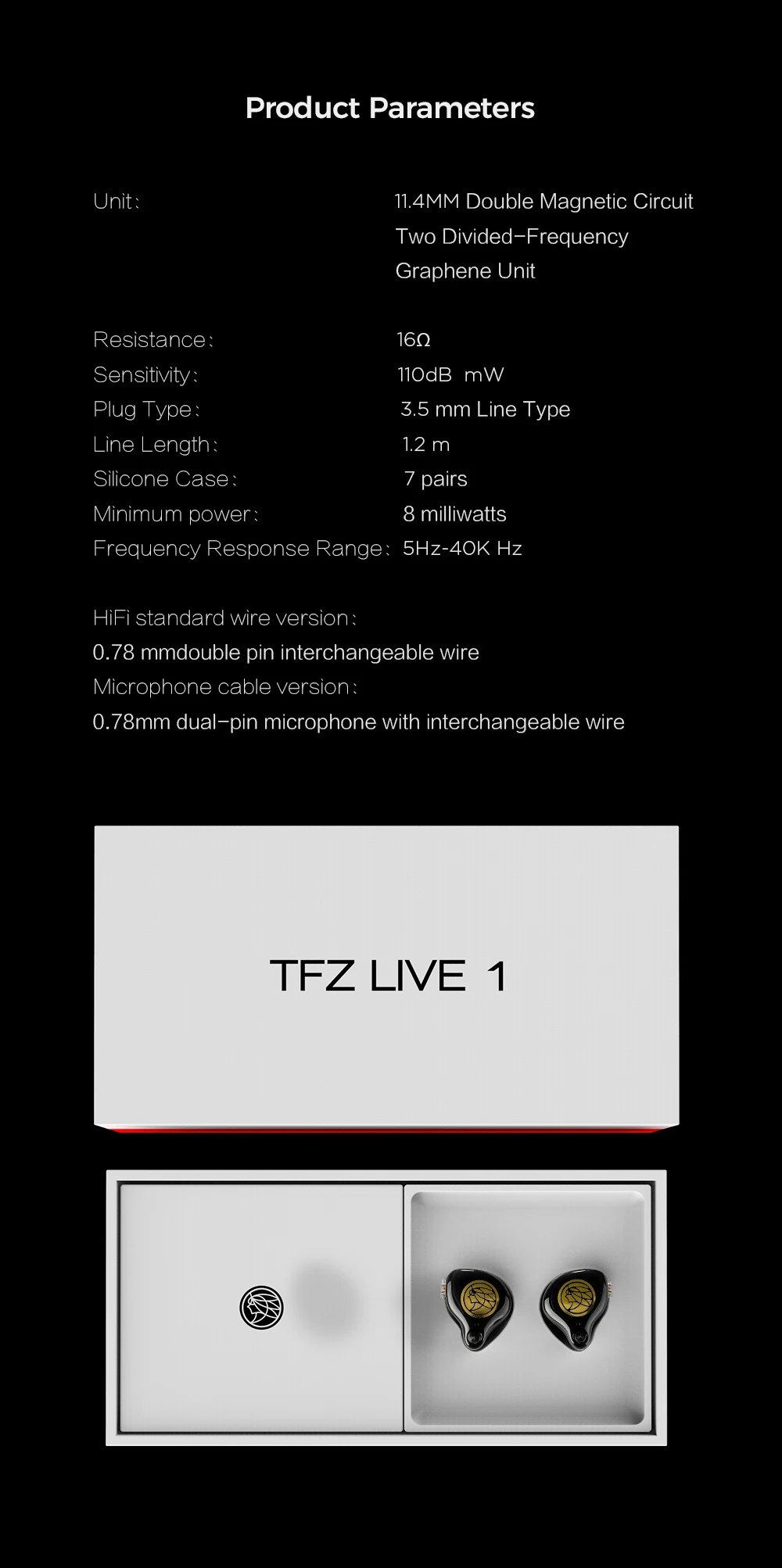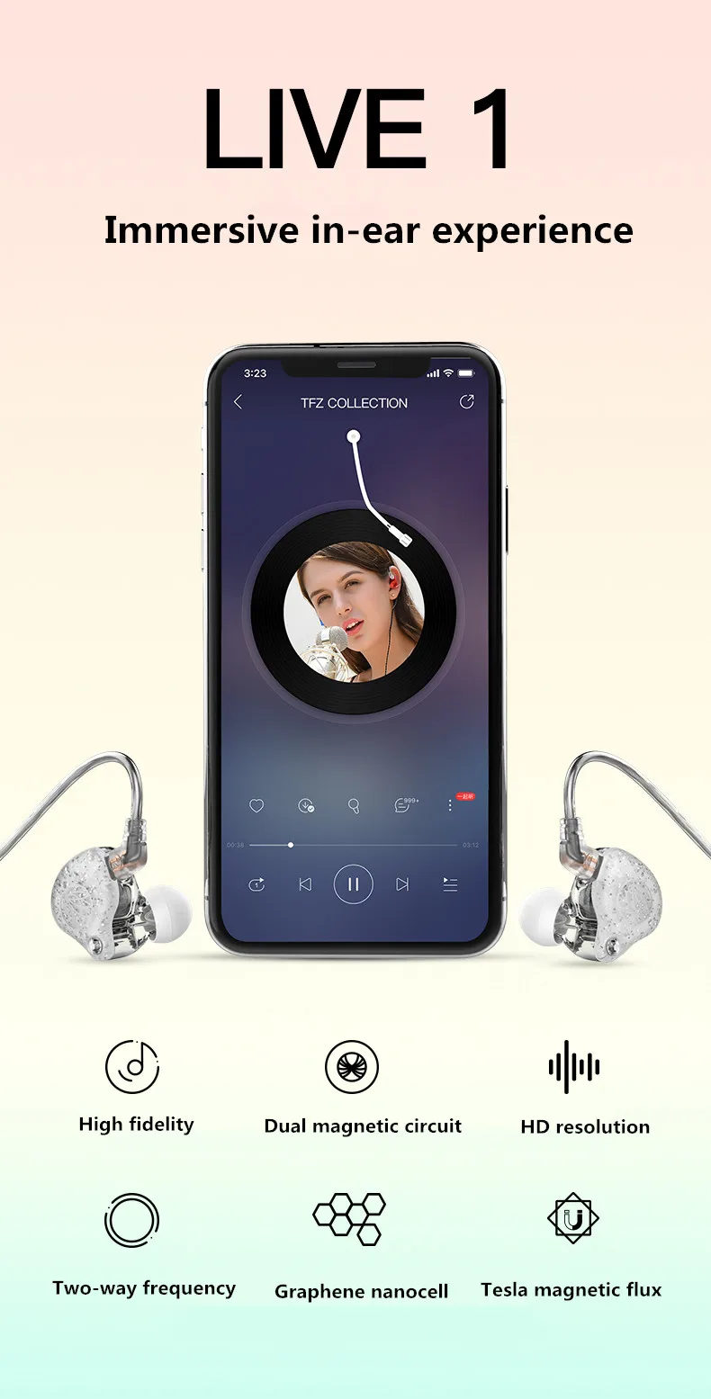 -Полностью загружен передовой технологией TFZ LIVE 1 оснащен профессиональными и более мощными акустическими блоками, полностью загружен передовыми технологиями, на основе высокоточного реставрационного дизайна на месте, С TFZ брендом, запатентованным Tesla-level юнитами и опытным тюнером, чтобы обеспечить высокую производительность. -Большое пространство, сильное ощущение изображения Запатентованный блок Tesla имеет реоптимизированный дизайн двойной магнитной технологии звукового сигнала, которая реализует ультра-высокое разрешение и позиционирование изображения, И ощущение пространства становится возможным (две рабочие магнитные цепи приносят больший Магнитный поток, легко управлять, легко представить сильные басы, богатые музыкальные детали). -Двойная магнитная цепь, разрешение HD Двухчастотный, UHF и средне-низкий дизайн выравнивания звука. -Запатентованный блок высокой производительности Соответствует акустическому стандарту HI-Res, широкому диапазону звука, 3 последовательных блока VGP с наградами. -Передача без потерь посеребренной проволоки Выбранный Высокоточный посеребренный бескислородный медный провод, передача без потерь сигналов высокой четкости, повышение необычайного прослушивания, доступны более Высокопроизводительные версии микрофона, четкие голосовые вызовы. -Справочное качество, с профессиональным плеером 1 большой магнитный поток Tesla обеспечивает непрерывную мощность, 16 Ω ЛЕГКО нажимает на плеер, 110 дБ полной энергии, шокирует низкую частоту. -Удобный светильник Одна сторона вес 3,8 г, как светильник как ничего, сочетается с однотонной одеждой в комплекте, удобный и текстурированный.