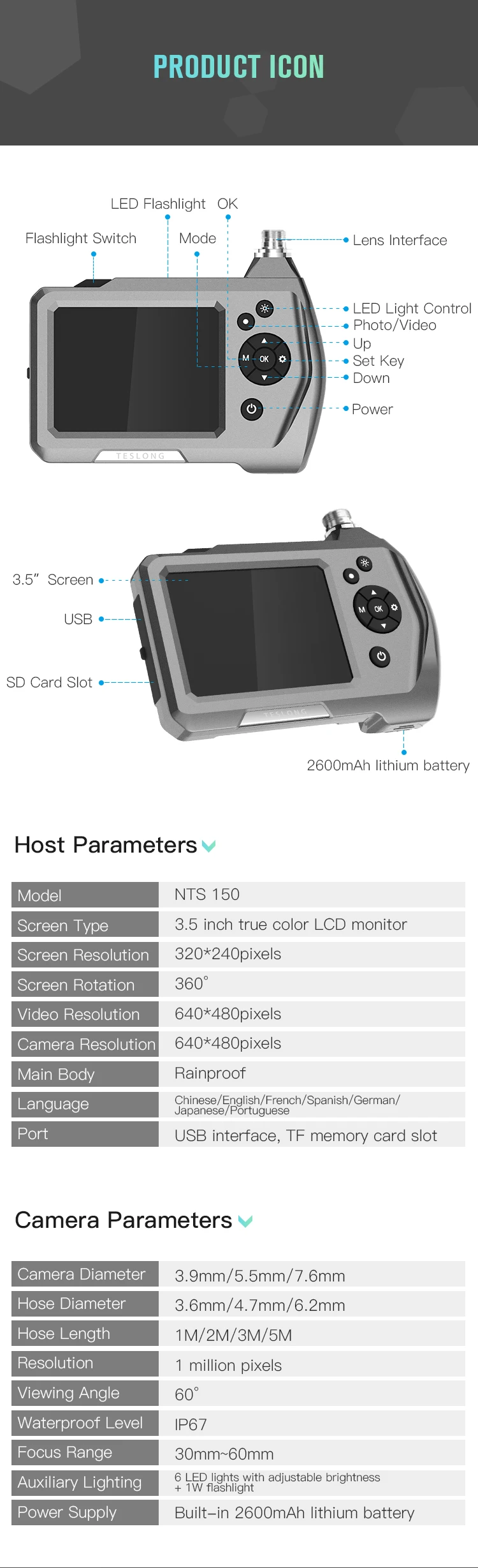 Диаметр: 7,6 мм/5,5 мм/3,9 мм опционально Диаметр вала: 7 мм/5 мм Длина вала: 100 см Разрешение: 1,0 мегапикселей Угол обзора: 50 ° Глубина поля: 50 мм-80 мм Светильник источник света: 6 Регулируемых светодиодов высокой интенсивности