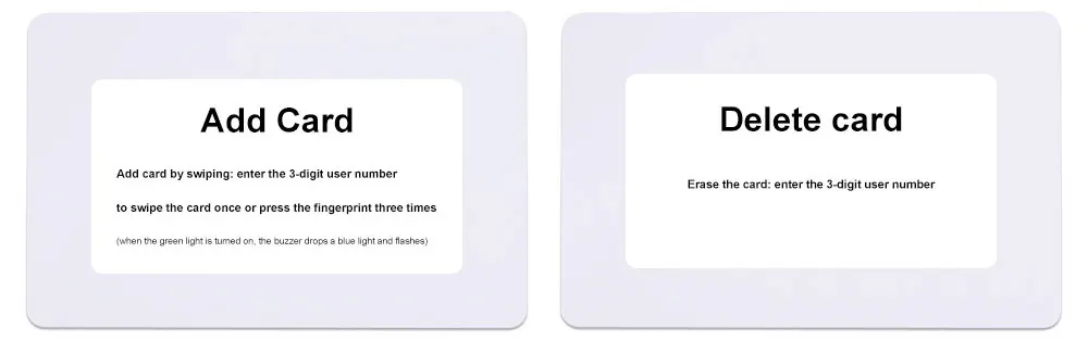 Вы можете установить карту управления: добавить карту и удалить карту. Вы можете использовать карту управления для добавления или удаления пользователей. Автономная работа, очень легко программировать!
