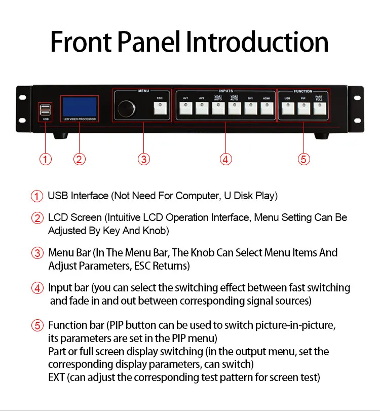 Плавно Переключайте любой канал ► Функция обнаружения сигнала ► Максимальная Разрешающая способность на выходе 1920x1080 @ 60 Гц, 2048x640 @ 60 Гц ► 7 каналов аналогово-цифровой видео вход (2 AV, 1 DVI, 1HDMI, 2VGA, 1 USB/SDI) ► 3-канальный блок питания с аналогово-цифровой видео вход (2 DVI, 1VGA) ★Pip, поп-функция > Поддержка большого соединения 10x10 Установка ящика слота для карты ► Ручка регулировки настройки