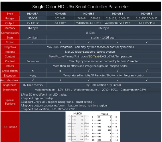 Новая технология обновления: двигаться быстрее, частота обновления выше. Более эффектный эффект: 3d-текст с особой формой, анимацией, текстовым и гипертекстовым поддержкой новой границы. Поддержка раздела в реальном времени (вторичная разработка), перегородки могут перекрываться. Максимальная поддержка s до 32 серого уровня, поддержка раздельного фона. Время поддержки, включая время цикла, u-диск также может поддерживать общие смарт-настройки. Поддержка температуры, влажности, яркости, дистанционного управления и т. д. (U6A не поддерживает). Поддержка, в наличии 7 цветов, дисплей, новинка обновленная шестой поколения карты.