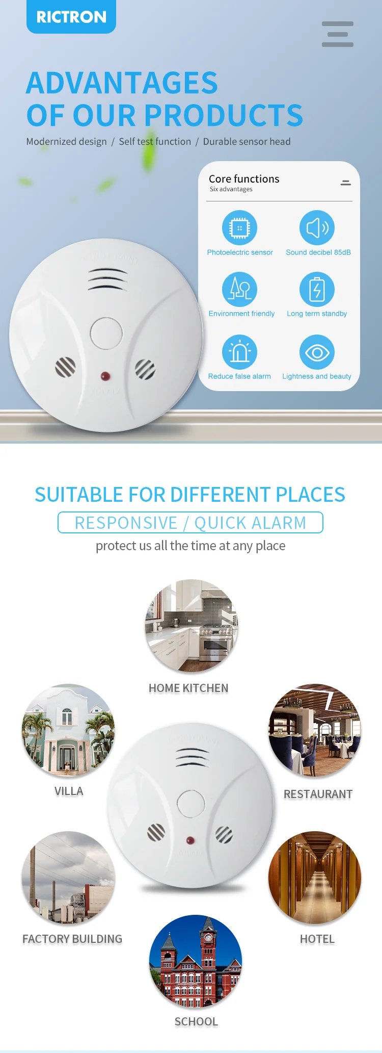 Сигнал тревоги имеет звуковой сигнал, который имеет более низкую и различную частоту. Это облегчает сигнал тревоги для пожилых людей и людей с легкой потерей слуха. Громкий 85 децибел сигнализация предназначена для того, чтобы помочь звонок даже наиболее надежно из слиперы. Одна сенсорная кнопка предотвращает ложные сигналы тревоги и позволяет тестировать устройство ежемесячно