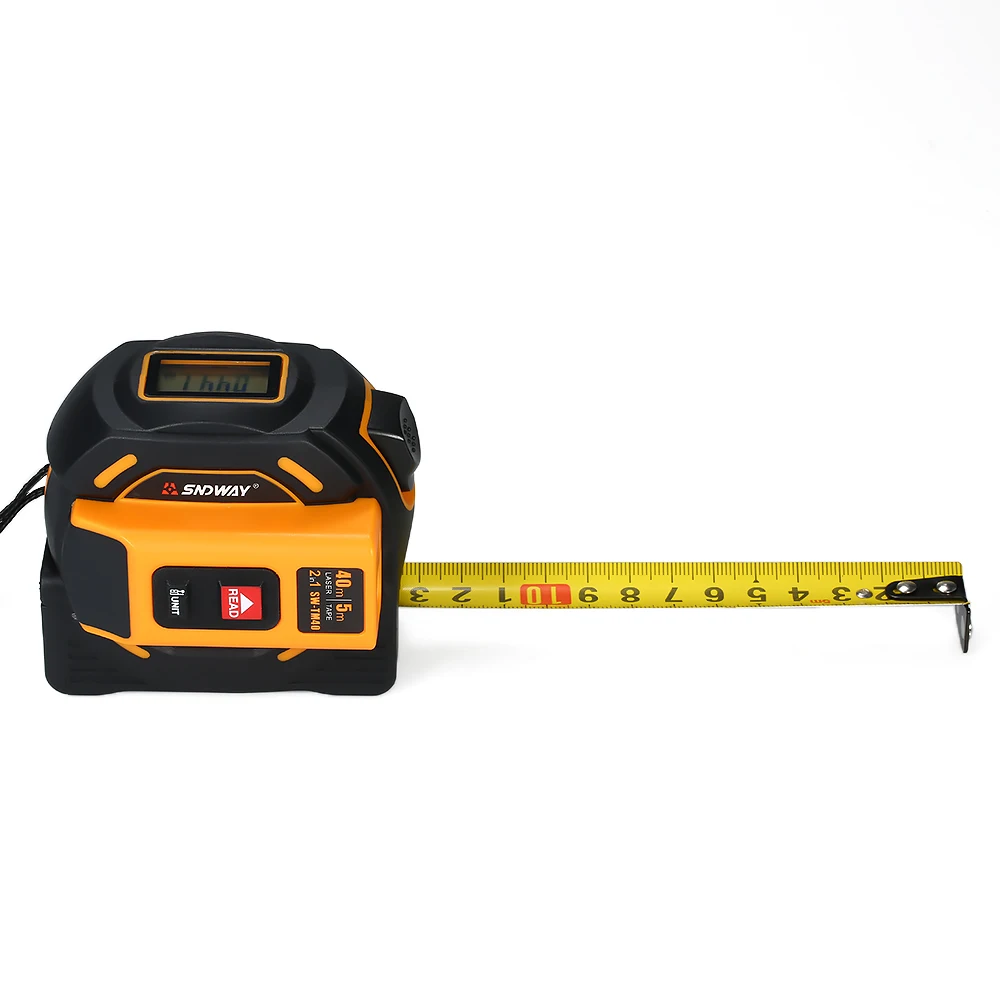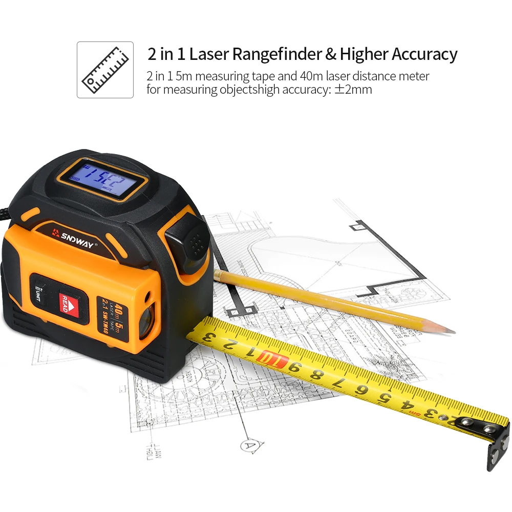 2 в 1 Лазерный дальномер и более высокая точность: 2 в 1 5 м измерительная лента и 40 м/60 м лазерный дальномер для измерения объектов; Высокая точность: ± 2 мм. Металлический Задний зажим предназначен для подвешивания на пояс или брюки для использования без рук.