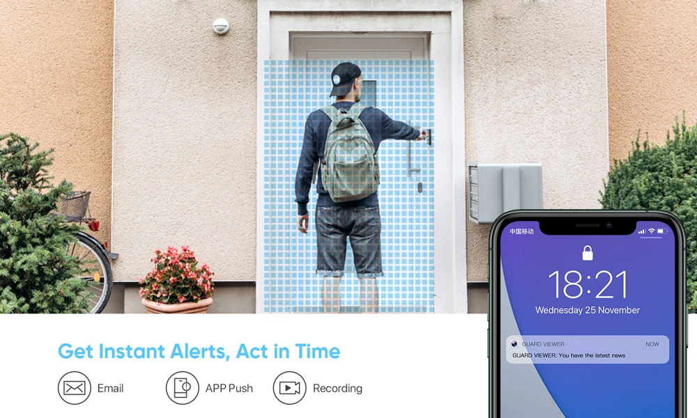При обнаружении движения в области мониторинга Мгновенная Электронная почта будет отправлена на ваш почтовый ящик и телефон автоматически. Получайте все сведения, даже если вы находитесь вдали от дома.