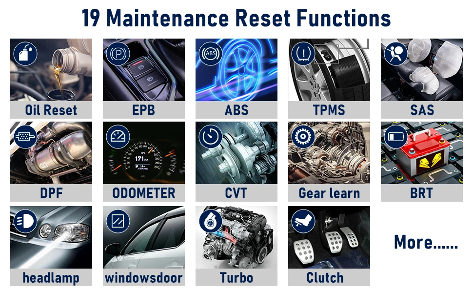 1.BRT, запасная батарея Позволяет легко найти новый аккумулятор подтверждена, как очистить ошибках на приборной панели и дисплей. 2.CVT Эта функция используется для того, чтобы сбросить компенсации код и инициализации и т. д. после того, как электромагнитный клапан или клапан средства ухода за кожей сборки был заменен 3.DPF, сажевый фильтр регенерации Пусть вы выполняете DPF для чистки, чтобы очистить засорение через горение твердых частиц в плену DPF фильтр. В тех случаях, когда DPF регенерации цикл завершен, DPF свет автоматически выключается. 4.EPB, электронный стояночный тормоз Позволяет выполнять обслуживание и обслуживание тормозных систем, Включая деактивацию и активации системы управления тормозом, кровотечения тормозной жидкости, открытие и закрытие тормозных колодок, и установка тормозов после замены диска или колодки, по нескольким брендам транспортных средств, в которых установлены электронные тормозные системы. 5. Снаряжение обучения Датчик положения коленчатого вала Адаптивное обучение. 6. Кодирование инжектора Эта функция заключается в том, чтобы сбросить и матч даты после инжектор заменяется. 7. Устойчивость к смазочным материалам и сброс Позволяет вам выполнить сброс службы лампы на приборной панели. Показателя сервиса система предназначена для того, чтобы привлечь внимание водителя в тех случаях, когда транспортное средство связи для обслуживания. 8.SAS, датчик угла поворота руля калибровки Позволяет выполнять калибровку датчик угла поворота руля. 9. Одометр спидометр Эта функция позволяет изменить дату одометром и Написать оригинальную дату в новая одометр. 10.A/F регулировки В соответствии с измерениями изменение подачи топлива для того, чтобы изменить производство пара котла и maintanin энергетический баланс в процессе горения. 11. Кровотечение из АБС ABS тормозов форм, и мы подарим Вам фирма тормозных колодок после высасывания воздуха. 12.TBA/TPS, выравнивание дроссельной заслонки Используя датчики положения дроссельной заслонки в дроссельной заслонки, ECU узнает открытая полная загрузка и полная защита позиций с помощью различных стран (холостой ход, номер части дросселя, WOT) известен как выравнивание дроссельной заслонки (TBA) 13. Система контроля давления в шинах, система контроля давления в шинах программирования Позволяет вам проверять id датчика шин от ЭБУ автомобиля и выполнять давления воздуха в шинах программирования и сброс настроек после шины и/или датчики TPM заменяются и/или шины подлежащие замене. 14. Клатч с яркими кристаллами адаптация 15. Сиденье матч 16. Изменение языка 17. ПМ 18.Windowsdoor 19.Turbo