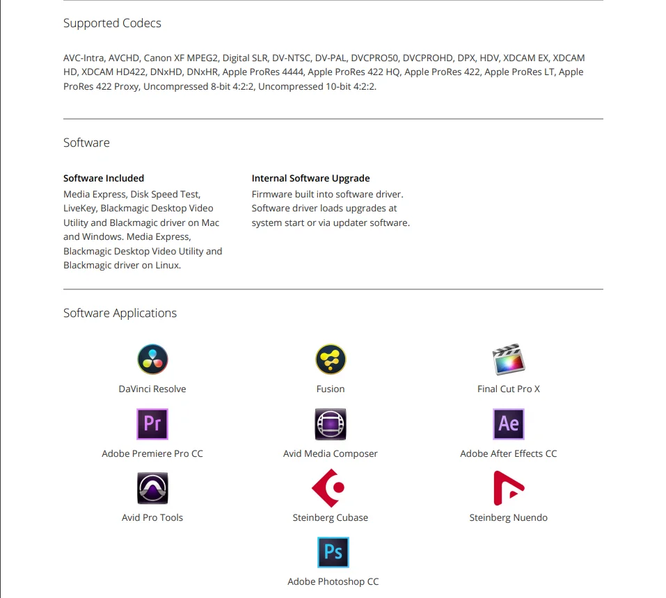 Другие поддерживаемые приложения включают: Foundry Nuke, Grass Valley Edius, Sony Catalyst Production Kit, Tools On Air Just: Play & Live & In, Softron MovieRecorder & MReplay, Adobe Flash Media Live Encoder, Telestream Wirecast, производитель Livestream, Resolume Arena, Magix Vegas Pro & Movie Edit Pro Premium, Corel VideoStudio Pro, CyberLink PowerDirector, Vidblaster X & Studio & Broadcast, Uniplay One & CG, CasparCG сервер, Magicsoft CG, Xsplit вещатель, Imagine Communications Velocity & InfoCaster, DevTek Easy Media Kit, Metus Ingest, Boinx Software mimily, cinegy Capture Pro, vMix Live, ProPresenter, Ventuz Director, Liveboard класса X и Coral CG, Glookast Capturer, открытая вещательная студия программного обеспечения, Nautilus NEMO3D, Burst Video Webclip2Go & [REC] Маркер, autocad Flame, Zoom. Видеостандарты SD видеостандарты 525i59.94 NTSC, 625i50 PAL HD видеостандарты 720p50, 720p59.94, 720p60 1080p23.98, 1080p24, 1080p25, 1080p29.97, 1080p30, 1080p50, 1080p59.94, 1080p60 1080PsF23.98, 1080PsF24, 1080PsF25, 1080PsF29.97, 1080PsF30 1080i50, 1080i59.94, 1080i60 2K видеостандарты 2K DCI 23,98 p, 2K DCI 24p, 2K DCI 25p, 2K DCI 23.98PsF, 2K DCI 24PsF, 2K DCI 25PsF Со сверхвысоким разрешением Ultra HD, видеостандарты Нет 4K видео стандартов Нет SDI соответствия SMPTE 259M, SMPTE 292M, SMPTE 296M, SMPTE 372M и SMPTE 425M A/B. SDI метаданных Поддержка RP 188/SMPTE 12M-2 и закрытые перегородки. Дискретизации звука Частота телевидения 48 кГц и 24 бит. SDI видео для отбора проб 4:2:2/4:4:4 Цвет пространство REC 601, REC 709. HDMI Разрешение Пиксель для пикселей HD Разрешение Вход от подключенного устройства. Несколько тарифной поддержки Видеосоединения SDI и HDMI переключаются между стандартным определением и высоким разрешением. SDI переключается между 270 МБ/с., 1,5 ГБ/сек. и 3 ГБ/сек.. Аппаратная рама буфера V210 (10 бит YUV), 2vuy (8 бит YUV), ARGB, BGRA (8 бит RGB), r210 (10 бит RGB), R12B,R12L (12 бит RGB). Цвет точности HDMI 8-bit RGB 4:4:4 до 1080p30, и 8, 10 бит YUV 4:2:2 во всех стандартов. SDI 8, 10, 12-bit RGB 4:4:4 до 1080p30, и 8, 10-bit YUV 4:2:2 во всех стандартах. Компьютер захвата 1 x Thunderbolt™3 для Mac и Windows. Питание от компьютера Thunderbolt host, включает в себя Blackmagic настольное видео SDK. Управление -Встроенная панель управления Нет. Поддерживает Teranex Мини Смарт Панель с 2,2 дюймовый цветной дисплей для просмотра видео, аудио метров и статус. Устройство Управление 1 х RS-422 управления палубой. Обработка: -Цветовое пространство преобразования Аппаратное обеспечение в режиме реального времени. В формате Full HD с разрешением вниз преобразования В режиме реального времени 10-битная оборудования понижающей конверсии на SDI B выход при работе в HD видео форматов при воспроизведении. Выбор между почтовым ящиком, анаморфным 16:9 и центральным вырезом 4:3 стиля. -Эффектов в режиме реального времени Final Cut Pro X внутренние эффекты. Премьера Pro CC Mercury воспроизведение двигательных эффектов. Avid Media Composer внутренние эффекты. Да Винчи решить. -Физическая Установка Требуется компьютер с Thunderbolt™3 USB-C порт. Пожалуйста, проверьте страницы поддержки, чтобы увидеть полные системные требования. Операционными системами: Mac 10,14 Мохаве, Mac 10,15 Catalina или более поздней версии. Windows 8,1 и 10, так и 64-бит. Linux Мощность требования Питание от кабеля Thunderbolt. Требуется компьютер с Thunderbolt™3 USB-C порт.
