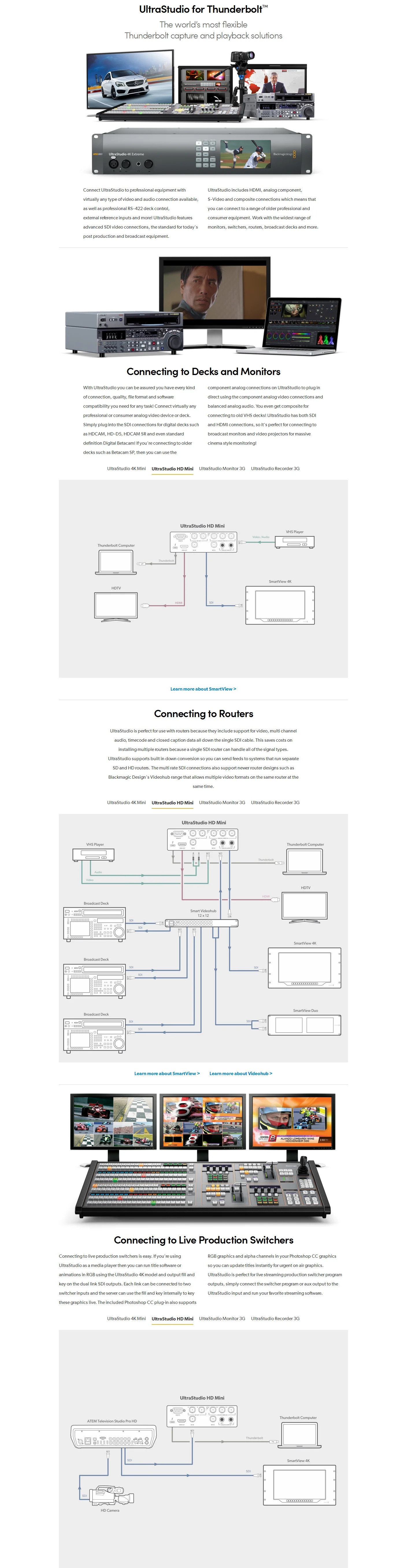 Blackmagic Design UltraStudio HD Mini Профессиональный коммутатор для трансляции 3G-SDI пульт дистанционного управления для аудио HDMI монитор для записи ТВ Описание продукта: UltraStudio HD Mini имеет профессиональные соединения качества трансляции, которые включают 3G-SDI, аналоговый YUV и композитный NTSC/PAL видео входы, а также справочный вход. Есть также два "аудио соединения для аналогового аудио входа, которые работают с сбалансированными и HiFi источниками. Кроме того, UltraStudio HD Mini может дистанционно управлять профессиональными блоками вещания с помощью встроенного RS-422 подключения. Для выхода вы получаете двойную ссылку 3G-SDI с заполнением и ключом, а также HDMI соединение для мониторинга видео с большим экраном телевизора!