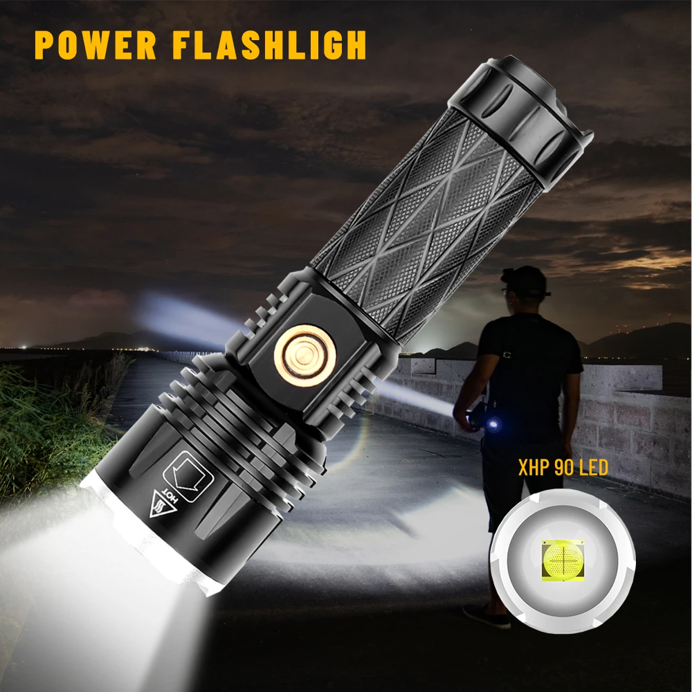 Model:1619 Bulb: XHP 90 Product size: 16*4.8*3.8CM Net weight: 245G Switch: Push the switch Battery: 1*26650/1*18650 (not included) Charging method: Type-c USB cable 5V 1A Zoom method: telescopic zoom Waterproof level: life waterproof Features: input and output, low battery reminder function Lumens: about 1800 lumens