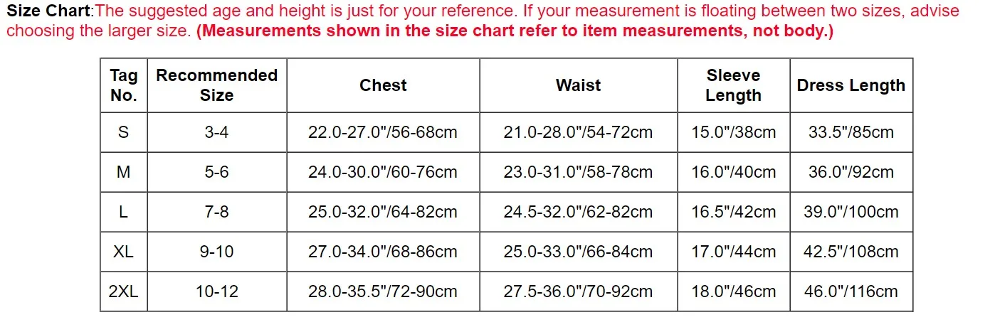 Номер бирки Рекомендуемый размер Грудь Талия Длина рукава Длина платья S 3-4 22,0-26,8 ''/56-68 см 21,3-28,3 ''/54-72 см 15,0 ''/38 см 33,5 ''/85 см М 5-6 23,6-29,9 ''/60-76 см 22,8-30,7 ''/58-78 см 15,7 ''/40 см 36,2 ''/92 см L 7-8 25,2-32,3 ''/64-82 см 24,4-32,3 ''/62-82 см 16,5 ''/42 см 39,4 ''/100 см XL 9-10 26,8-33,9 ''/68-86 см 26,0-33,1 ''/66-84 см 17,3 ''/44 см 42,5 ''/108 смПолезные советы: Замеры делаются вручную, поэтому учитывайте небольшие погрешности. Цвет на фото может немного отличаться от реального товара из-за особенностей цветопередачи различных мониторов.
