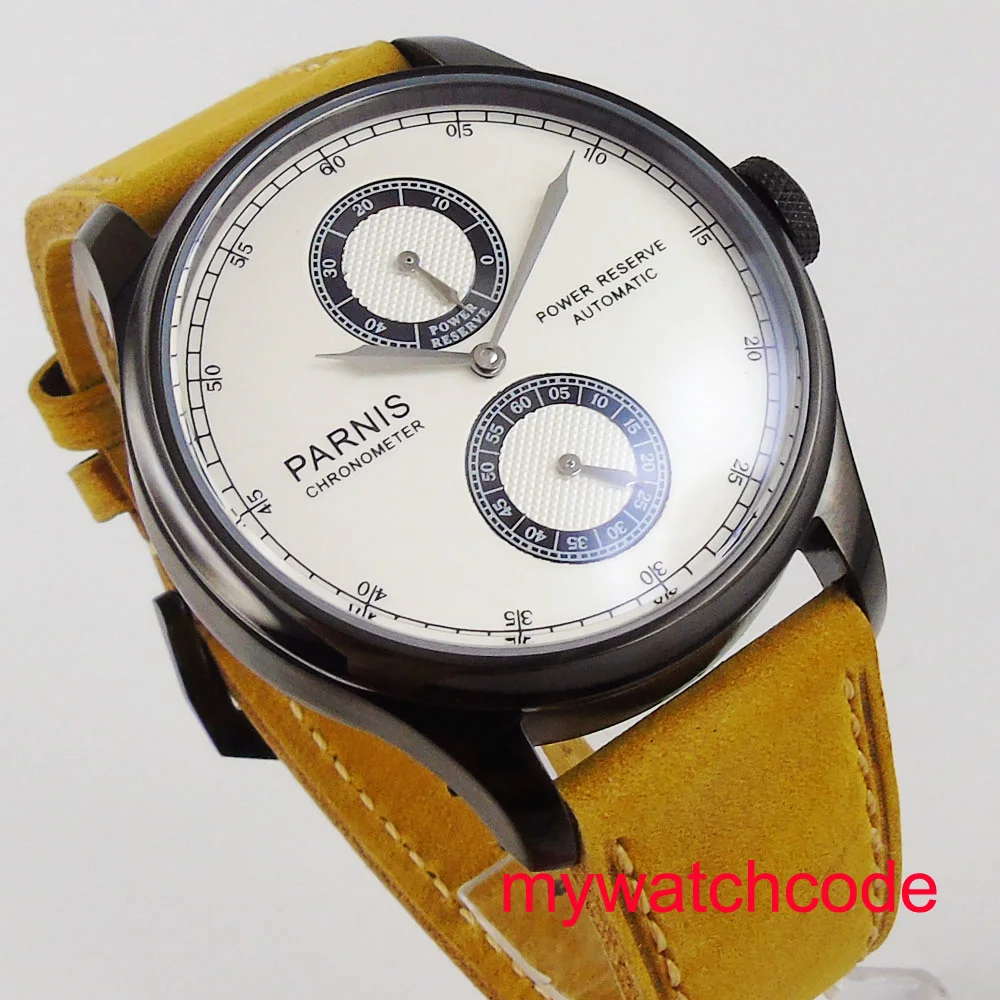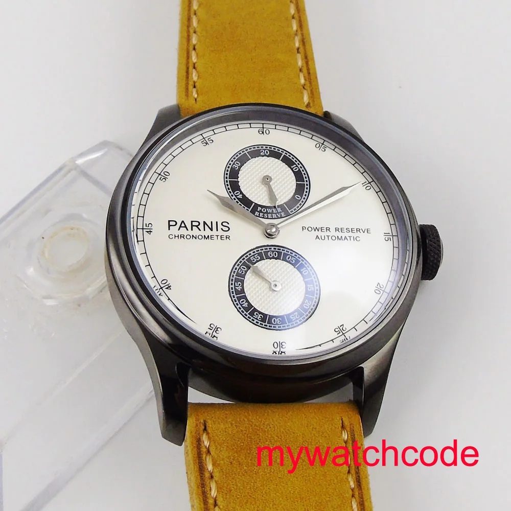 Бренд: Парнис Размер: 43 мм Механизм: Чайка ST2842 автоматический механизм Корпус: твердый корпус из нержавеющей стали 316L Кристалл: специальное устойчивое к царапинам минеральное стекло Циферблат: часы с белым циферблатом Ремешок: 20 мм ширина желтый кожаный ремешок