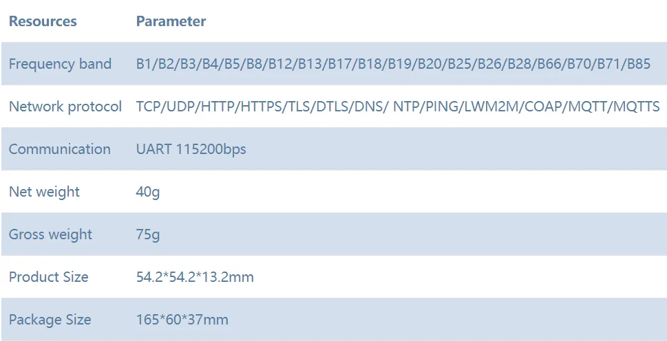 -Прочная -Поддержка режима низкого энергопотребления -Сильная способность доступа к сигналу -Независимый внешний источник питания -В команде контроля -Тип sim-карты: MicroSIM -Сигнал состояния: два светодиодный индикатора -Внешняя антенна: SMA антенна -Серийное общение: UART 115200bps -Диапазон частот: B1/B2/B3/B4/B5/B8/B12/B13/B17/B18 /B19/B20/B25/B26/B28/B66/B70/B71/B85 -Скорость передачи данных: Загрузка: 150 кбит/с Загрузка: 126 кбит/с -Прототип: TCP/UDP/HTTP/HTTPS/TLS/DTLS/DNS/ NTP/PING/LWM2M/COAP/MQTT/MQTTS