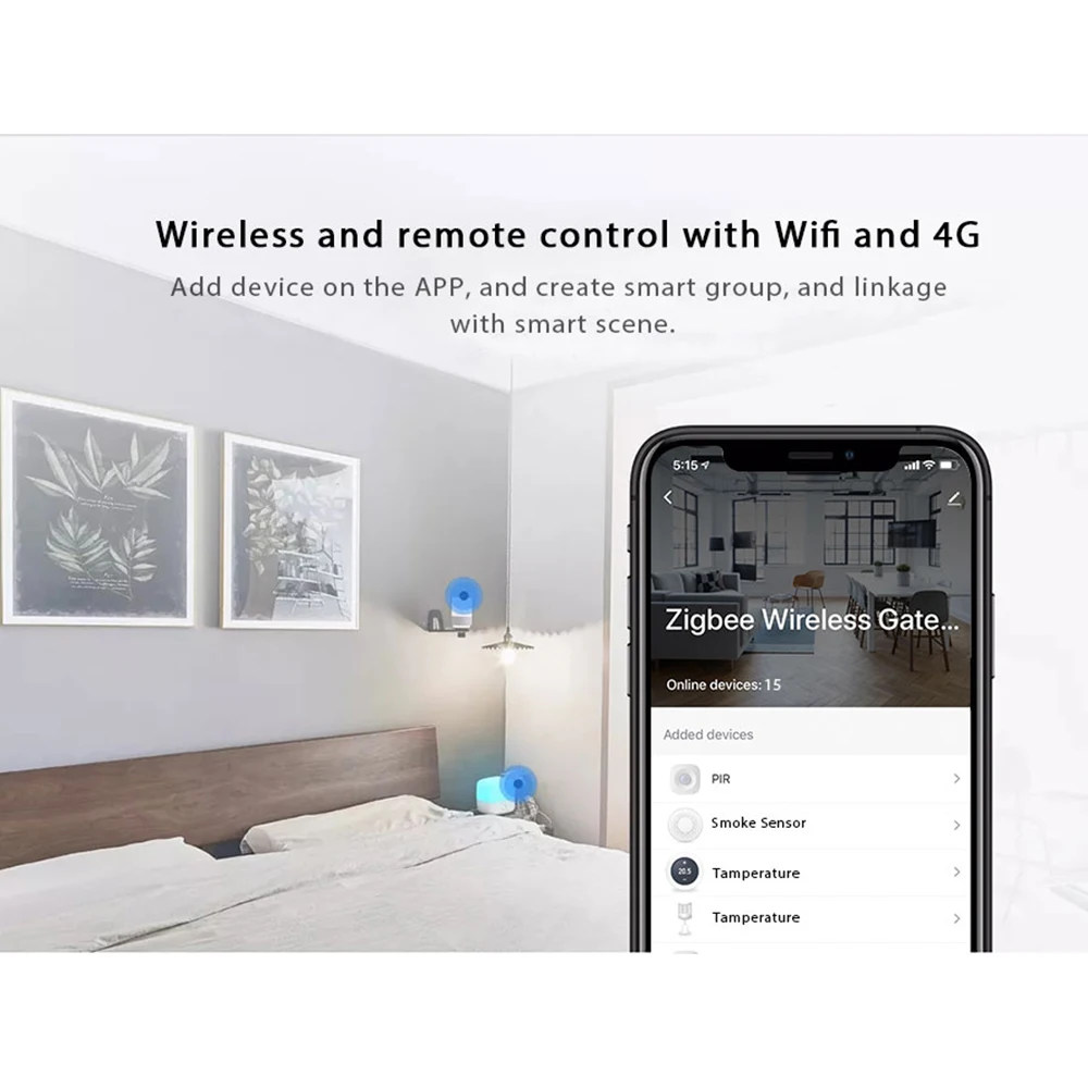* Пульт дистанционного управления Tuya Smart App: Добавление устройств, сброс устройства, вечерние управление и групповое управление для удовлетворения потребностей умных приложений, все поддерживаются концентратором. Просто используйте свой смартфон для управления системой удаленного набора безопасности, подключенной к концентратору в любое время и в любом месте.
