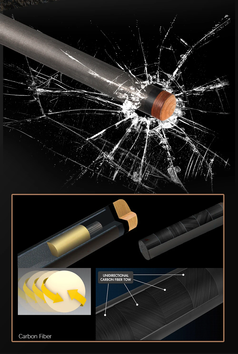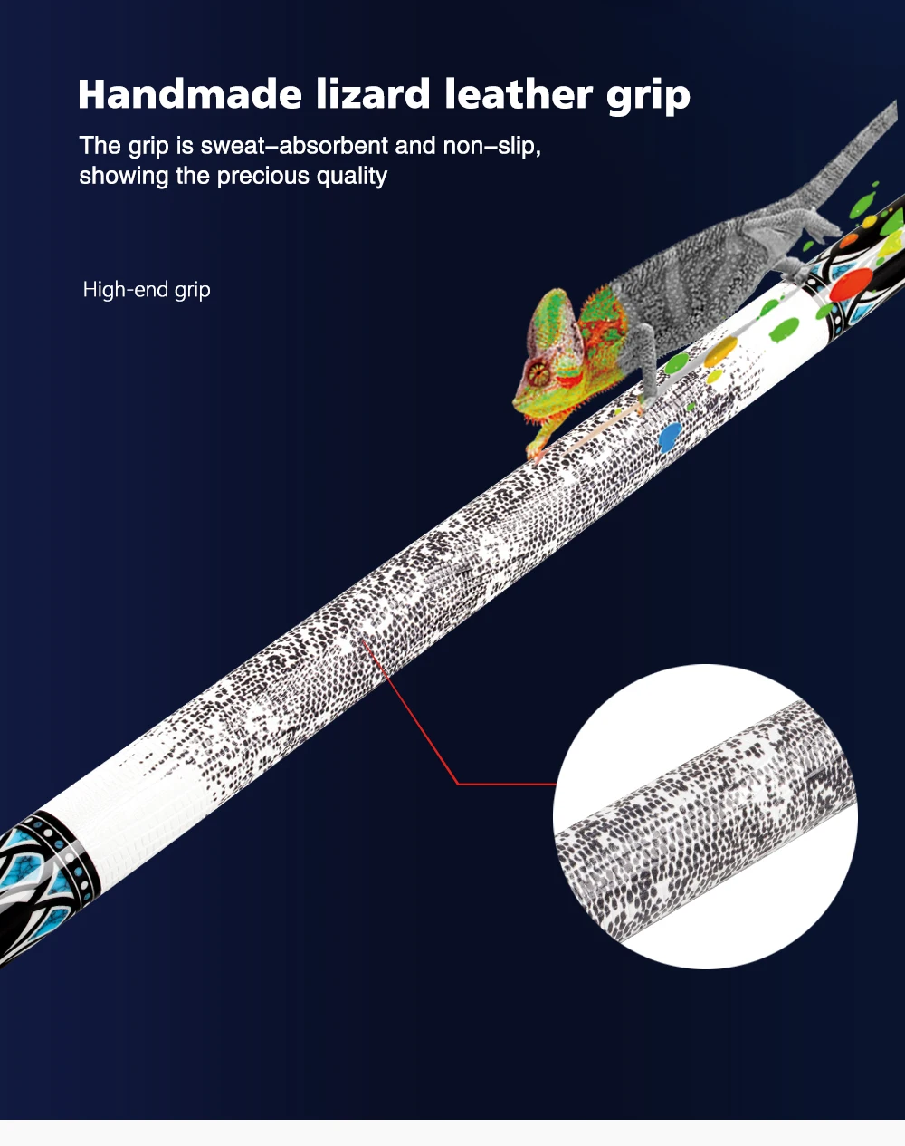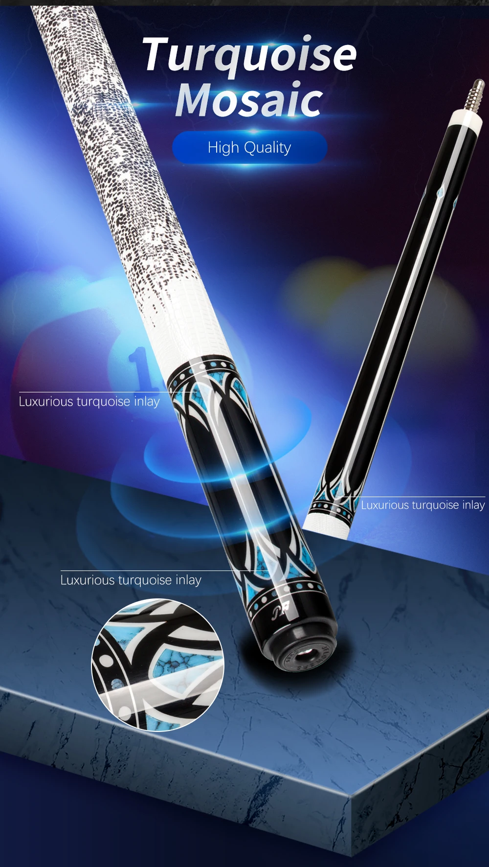 1. Кожаный захват ящерицы, впитывающий пот и нескользящий, выдержанный темперамент 2. Черное дерево, жесткий и мощный 3. Бирюзовая мозаика, стремление к качеству 4. Наконечник из углеродного волокна прочнее, чем закаленное стекло 5. Черный технологический вал использует аэрокосмический чистый углеродный волокнистый композитный материал, Внешний вид-карбоновый черный, полый корпус делает вал легче, но углеродное волокно может быть более мощным, чем цельное дерево cue 6,3/8*8 радиальные стежков на каждые 11 Зубы шарнир, нет вышивки и Нет эрозии, хорошая прочность, корсет для живота, бесшовное стыковые соединения, передачи высокой прочности 7. Каждый cue оснащен отдельным лазерным кодом защиты от подделок, аутентичность может быть определена, гарантия подлинности