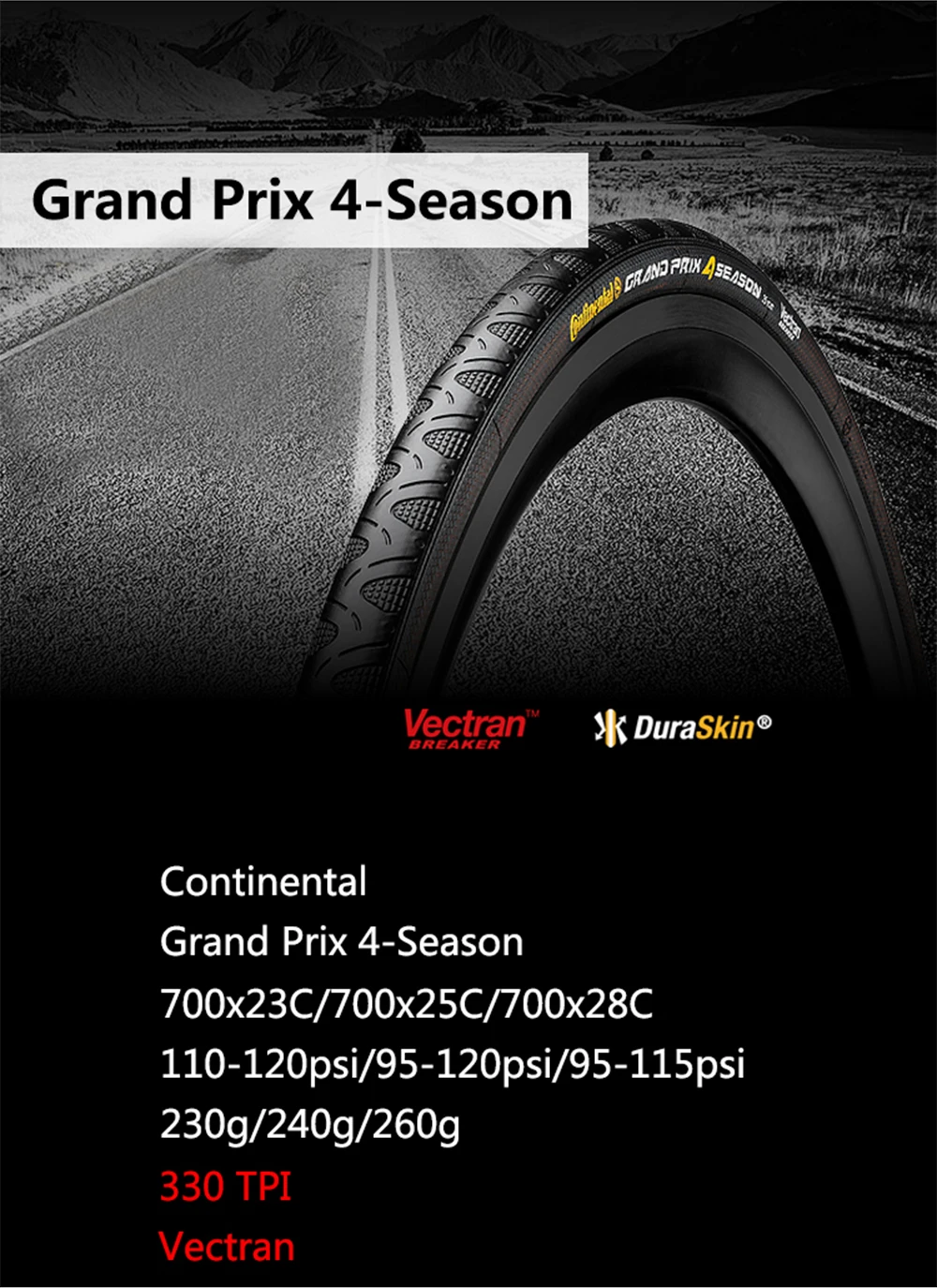 * DuraSkin® * 3 слоя/330 tpi * 2xvectran™Выключатель * Вес: прибл. 240 г/шт. * Вариант модели: Grand Prix 4 сезонная стандартная серия 700x25C / Grand Prix 4 сезонная черная серия 700x25C