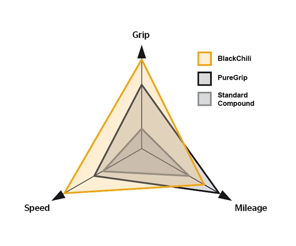 Континентальный нефтеперерабатывает недавно разработанные синтетические каучуки с натуральным каучуком с доказанным высокоэффективным протекторным соединением. GP4000S II использует эти каучуки со специальными нанометрическими частицами сажи, которые оптимизированы по форме и поверхностным свойствам для наилучшего использования для предполагаемой шины. Шины с соединением BlackChili достигают беспрецедентного уровня производительности. По сравнению с предыдущими лучшими активированными кремнеземными соединениями, шины BlackChili имеют на 26% меньше сопротивления качению, на 30% выше значение трения (сцепление) и на 5% больше пробега.