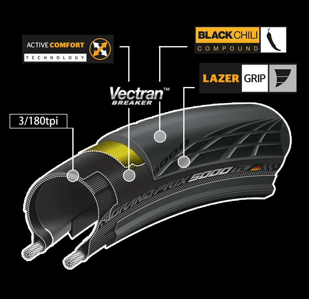 Сочетая бескамерные технологии с фантастическими дорожными характеристиками шин GP4000 и делая их еще лучше, эта модель Grand Prix 5000 использует современные достижения в шинах для доставки лучших автомобильных шин континентального региона. Изготовлен из легендарного соединения BlackChili, гарантирован непревзойденный захват и баланс, с напряженной лабораторией и дорожным испытанием, показывающим осязаемые преимущества для современного велосипедиста.