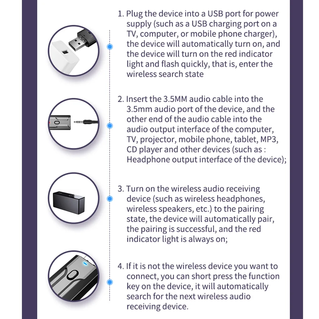 С прикрепленным кабелем 3,5 мм этот адаптер передатчика приемника может широко использоваться в вашем компьютере, ноутбуке, домашней стереосистеме, гарнитуре, смартфоне, MP3-плеере, cd-плеере и т. д.