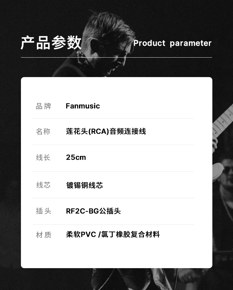 Модель: C003 Материал: ROXTONE Черный Позолоченный штекер lotus RF2C-BG Двухъядерный аудиокабель CANARE L-2E5AT Количество проводников: 2; Стандартный диаметр провода: 5 мм + 0,5 Площадь поперечного сечения проводника: 0,31 мм/23AWG Количество проводников медных проводов: 12 Диаметр проводника медного провода: 0,18 мм Крутящий момент: 30 мм Сопротивление сердечника постоянного тока: 6,2 Ω/100m Напряжение изоляции: 500 В переменного тока/мин Изоляция проводника: полиэтилен из сшитого полиэтилена Щит: Луженая медь витая твист щит + высокой плотности алюминиевая фольга бумажный щит Материал куртки: мягкий ПВХ/неопреновый композитный материал Длина шнура: 25 см (без вилки) Штекер: используется штекер lotus (RCA) ROXTONE, черный корпус, Позолоченный разъем. Продукт соответствует эргономичному дизайну корпуса из цинкового сплава, позолоченных соединителей 24K и хорошей обработке поверхности штифтов, эффективной стойкости к окислению, высокой точности передачи и уникальному дизайну внешнего вида. Эргономичный корпус из цинкового сплава Заземление перед касанием сигнала, отсоедините сигнал перед заземлением Отсутствие помех, не повредит поднос динамика Дополнительная оболочка кабеля из ПВХ обеспечивает отличную защиту от гибки кабеля Контакт: латунь Контактное покрытие: золото
