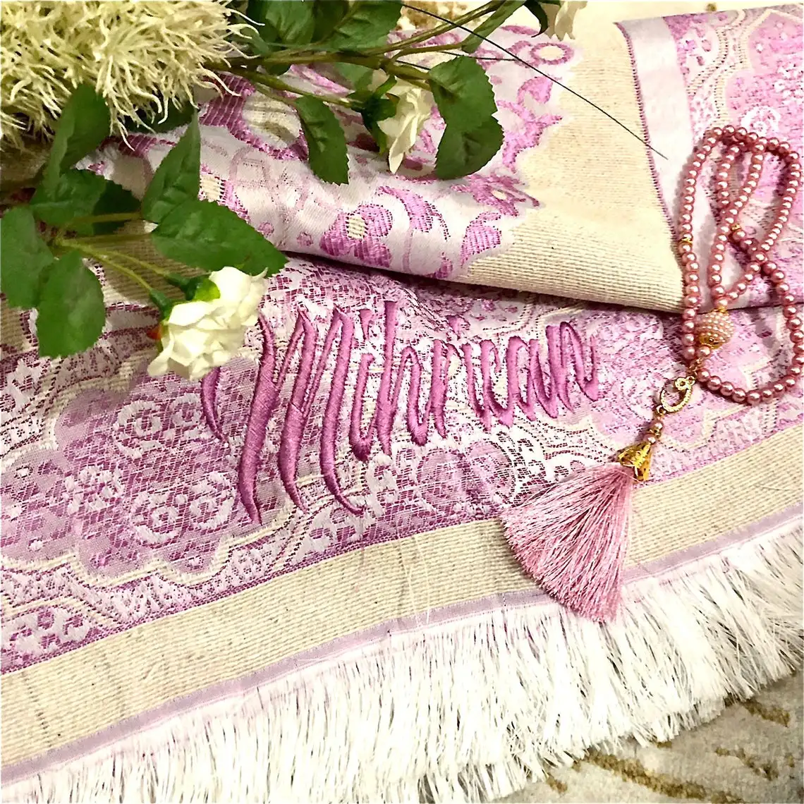 Персональный молитвенный коврик поставляется с tasbeeh (молитвенные бусы). Вы покупаете только молитвенный коврик и tasbeeh. Все остальные товары, показанные на фотографиях, не включены в покупку.