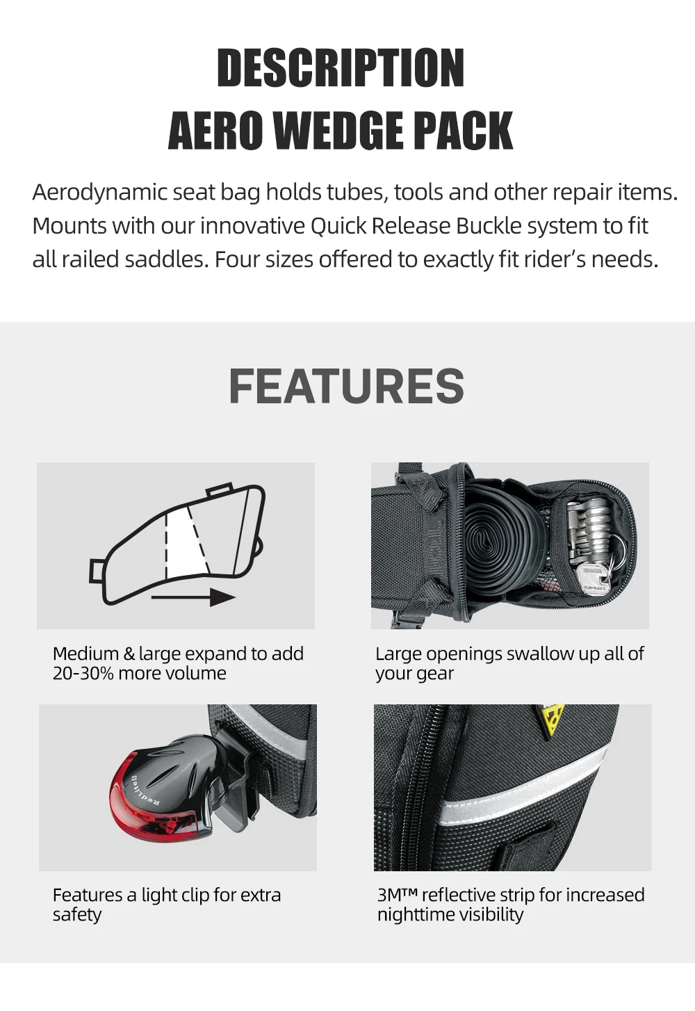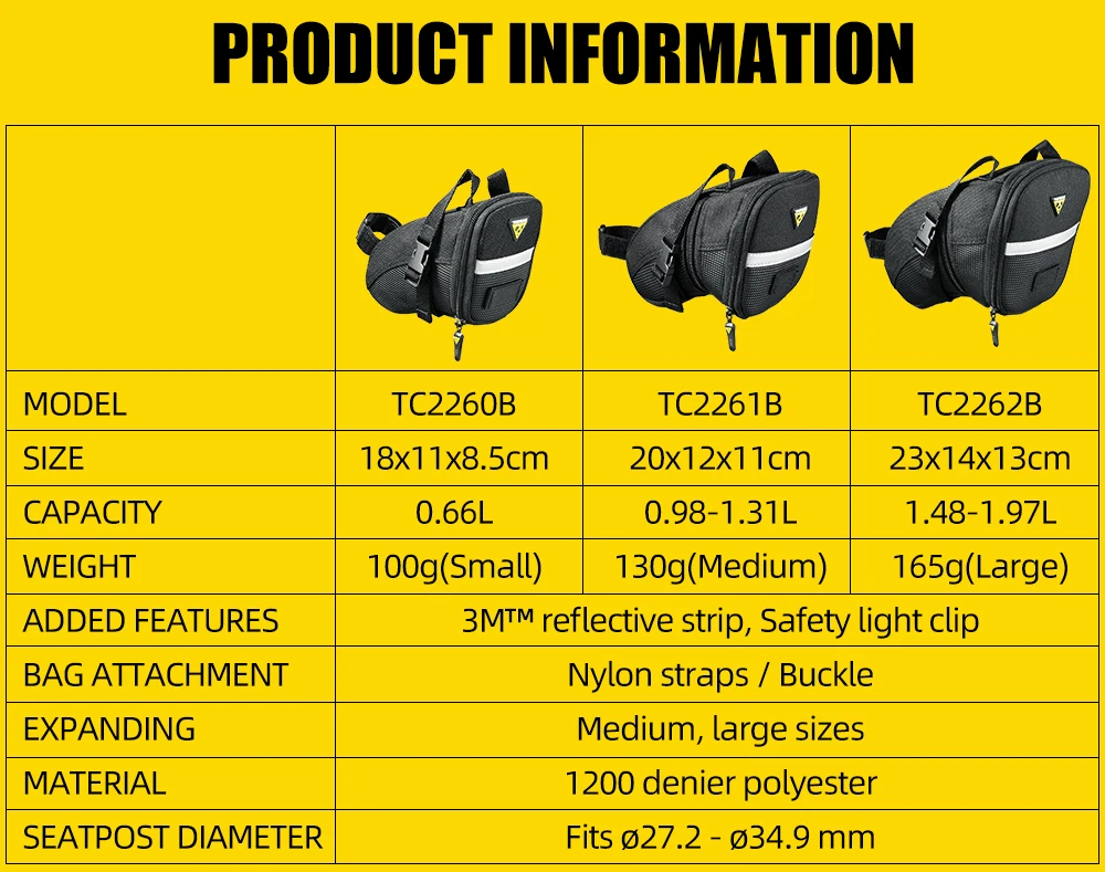Дополнительные характеристики: 3 м™Светоотражающая полоса, зажим на светильник безопасности * 3 м™Является зарегистрированным товарным знаком компании 3M. Крепление сумки: нейлоновые ремни/Пряжка Емкость: 0,41 л/25 ci (Micro) 0,66 л/40 ci (маленький) 0,98-1,31 л/60 - 80 ci (средний) 1,48-1,97 л/90 - 120 ci (большой) Расширение: средние, большие размеры Материал: полиэфир 1200 денье Диаметр Подседельный штырь: подходит для ø27.2-ø34,9 мм Размер: 16x8x7,5 см/6,3 "x 3,1" x 2,9 "(Micro) 18x11x8,5 см/7,1 ”x 4,3” x 3,3 ”(маленький) 20x12x11 см/7,9 "x 4,7" x 4,3 "(средний) 23x14x13 см/9,1 "x 5,5" x 5,1 "(большой) Вес: 85 г/2,99 унций (микро) 100 г/3,52 унций (маленький) 130 г/4,58 унций (средний) 165 г/5,81 унций (большой)