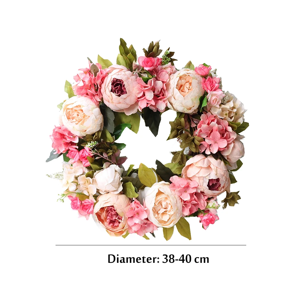 Декоративный венок пиона. Этот весенний цветочный венок изготовлен из искусственного пиона, розы, листьев пиона и цветов гортензии, которые покрывают как спереди, так и сзади, украшенный коричневыми прочными веточками, которые покрывают основание цветочного венка, делают его вечным сезонным домашним декором.