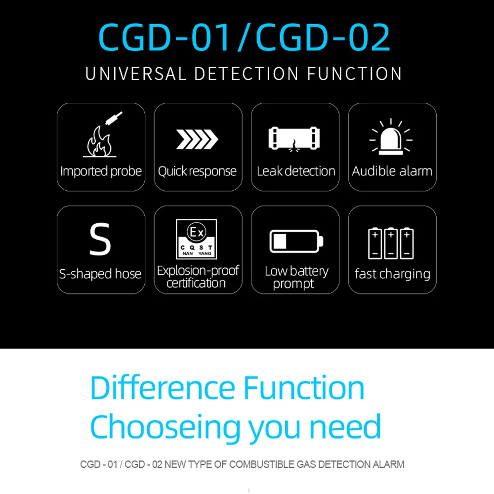 Обнаружение нескольких легковоспламеняющихся газов: метан/природный газ, газ/окись углерода, бензин/спирт, пропан, бензол, трихлорэтан, Этан, n-бутан, галогенированные углеводороды.