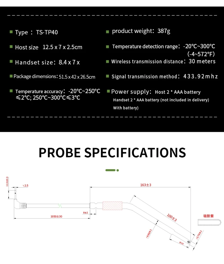 Диапазон обнаружения температуры: -20 ~ 300 градусов по Цельсию (-4 ~ 572 по Фаренгейту)