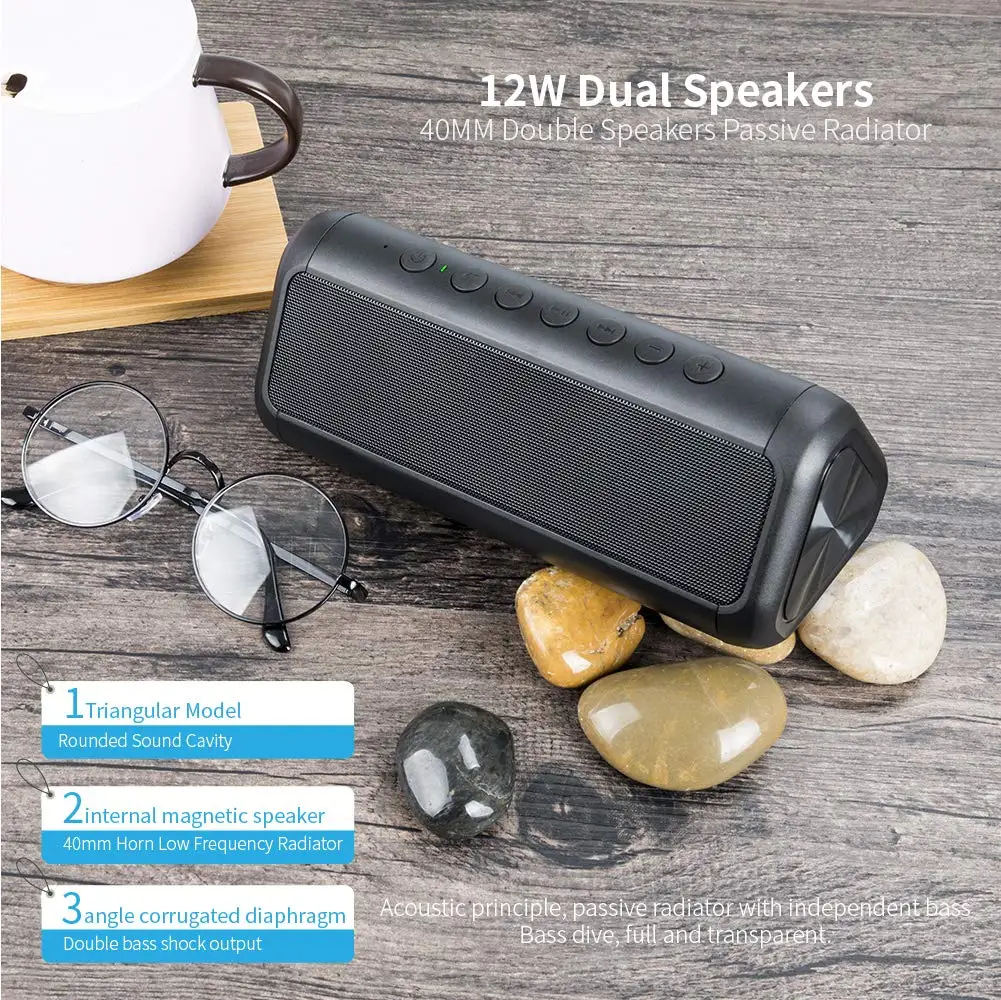 ☀Супер бас стерео звук: Этот портативный bluetooth-динамик с двумя высокопроизводительными драйверами 12 Вт (6 Вт x 2) и пассивным сабвуфером. Супер басы бумы с менее чем 1% общего гармонического искажения, Наслаждайтесь 360 ° объемного звука дома или на открытом воздухе.