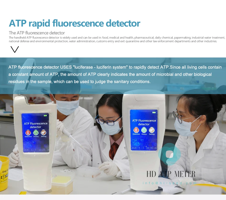 У него есть версия на английском и корейском языках. Если заказ клиента превышает 10 комплектов, может быть настроена машина для наведения языка. Для большого количества заказа, пожалуйста, свяжитесь напрямую с продавцом. Быстрый флуоресцентный детектор СПС Содержание СПС в живых микроорганизмах является относительно постоянным. В этом тампоне содержание СПС определяется путем определения значения люминесценции, таким образом, определение содержания живых микроорганизмов в образце. Тампон имеет две структуры. Нижний конец соединителя поверхностного тампона соединен с ватным тампоном. Ватный тампон содержит бактериальный лизат, содержащий литические бактерии и другие микроорганизмы. Нижняя часть Соединительной головки коллектора водяного образца соединена с коллектором водяного образца, И трубка содержит бактерии лизата лизированных бактерий и других микроорганизмов. Головка тампона содержит ферментный раствор реакции, который излучает светильник в ответ на СПС. Образцы на поверхности объекта собираются ватными тампонами или коллектором образцов воды для сбора образцов жидкости. Образцы взаимодействуют с бактериями лизата для высвобождения АТФ в микроорганизме, а затем смешиваются с ферментной реакционной жидкостью для получения люминесценции реакции. Значение люминесценции можно прочитать с помощью инструмента.