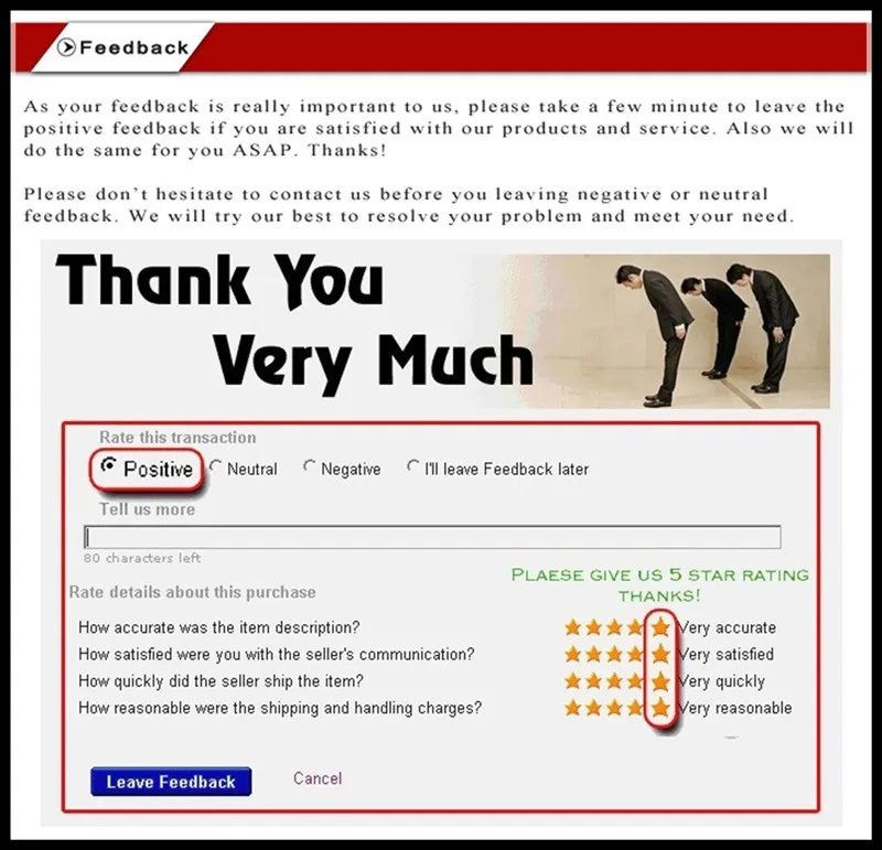 Мы высоко ценим ваше мнение и предложения как покупателя, мы сделаем все возможное, чтобы получить наиболее положительные отзывы. Если вам не нравится наша продукция по какой-либо причине, пожалуйста, не стесняйтесь прислать нам ваши отзывы, мы будем очень признательны! Пожалуйста, свяжитесь со мной непосредственно перед тем, как оставить отзывы в хорошем или отрицательном состоянии!