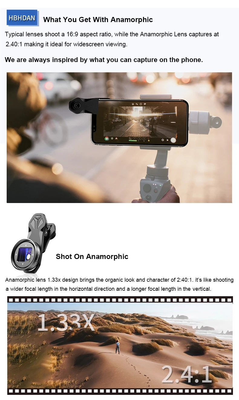 【 4K HD и меньше искажений 】apexel объектив для телефона сделан из стекла кинокласса и анодированного алюминия с асферическим объективом, эффективно корректирует сферическую аберрацию и осевую хроматическую аберрацию в процессе визуализации, уменьшение искажений изображения менее 2%. 4K HD видео, высокая цветопередача, дает вам действительно четкое видение, вдали от Видео Спорт vertigo. 【Получите более широкий обзор экрана 】широкоэкранный объектив деформации, выпуская ограниченный экран на мобильный телефон, и получите широкоугольный объектив 1,33x без ущерба для их разрешения, с овальным боком, В анаморфические линзы способна повысить the horizon Капитана Америка horizon по 33%. Увеличение Визуального Поля не является простым увеличением, но открывает параллельный мир за пределами обычной перспективы, и действительно и четко приносит вам опыт создания мобильного видео, который никогда не был замечен раньше 【Как это работает? 】Анаморфные линзы придают органический вид и характер 2:4:1 с дизайном 1,33x. Это похоже на съемку более широкого фокусного расстояния в горизонтальном направлении и более длинного фокусного расстояния по вертикали. Подходит для записи широкоформатных видео. Работает с приложением Pro Camera (ProMovie,FILMIC PRO), чтобы снять изображение при съемке видео и фотографий. Или после съемки по телефону + анаморфный объектив 1,33x, используйте ПРОГРАММНОЕ ОБЕСПЕЧЕНИЕ Adobe Prime Pro для изменения длины и ширины от 100 【Профессиональный уровень кинематографи】одна из уникальных особенностей анаморфного является его способность дать вам кинематографический взгляд на ваши видео. Когда объектив подвергается яркий светильник, либо через автомобильный головной светильник s, уличный светильник s, либо любой жесткий светильник во время ночных съемок, он создает вспышку объектива, похожую на то, что вы видите в фильмах. Органические вспышки и искажения для дополнительного персонажа и глубины. 【Почему бы не купить? 】Этот деформируемый объектив прост в установке и поставляется со всем, что вам нужно, чтобы начать съемку фильмов. Он широко совместим с такими приложениями, как приложение FilmicPro, приложение MoviePro и универсальный Алюминиевый зажим, совместимый с большинством смартфонов, таких как iPhone, Pixel, Samsung Galaxy и OnePlus. Идеально подходит для записи широкоформатных видео, vlog, Tiktok, Filmmaking телефона. Просто чтобы стать вашим собственным режиссером прямо сейчас! Производите и редактируйте свои рассказы о путешествиях, новости. Снимайте кинотеатры нового уровня прямо сейчас!
