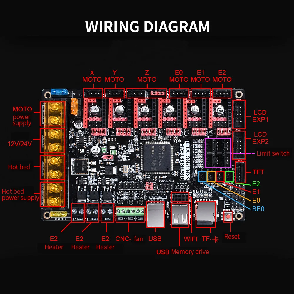 1) размер внешнего вида: 147*95 мм 2) Размер установки: 138*86,5 мм 3) Микропроцессор: ARM 32 бит Cortex™-M4CPU 4) Входное напряжение: DC12V--DC24V 5) драйвер двигателя: Поддержка TMC5160, TMC2208, TMC2209, TMC2130, ST820, LV8729, DRV8825, A4988 и т. д. 6) Поддержка режима работы привода: TMC2130SPI, TMC5160SPI, TMC2208UART 7) интерфейс привода двигателя: X, Y, Z, E0, E1, E2, 6 каналов 8) интерфейс датчика температуры: T0, T1, T2, T3 всего 4 канала 100KNTC (термостойкость) 9) Экран дисплея: BIGTREETECH-2.8 дюймов TFT, BIGTREETECH-3.5 дюймов TFT, LCD2004, LCD12864 10) интерфейс связи ПК: квадратный USB, легко подключается и отключается, скорость передачи данных 115200 11) Расширенная поддержка функции интерфейса: обнаружение прерывания материала, непрерывная печать после отключения питания, завершение работы после окончания, автоматическое выравнивание, BL Touch, WIFI, PWM, ADC, UART, I2C и SPI, И т. д. 12) Поддержка формата файлов: g-код 13) структура опорной машины: XYZ, delta, kossel, Ultimaker, corexy 14) рекомендуемое программное обеспечение: Cura, Simplify3D, pronterface, Repetier-host, Makerware 15) мульти-источник питания, обмен давлением тока одной линии электропередачи.