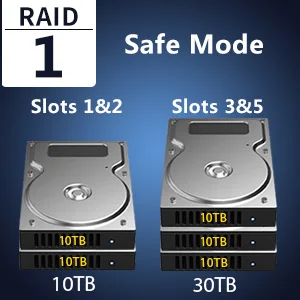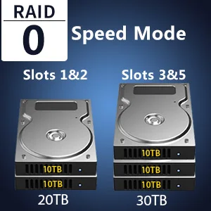 Можно настроить диски в режимах RAID 0, RAID 1, одного диска для жесткого диска в Слотах 1 и 2 и одного диска для слотов 3-5. Это позволяет настроить блок для удовлетворения ваших уникальных потребностей в безопасности данных, высокой производительности или максимальной емкости хранилища. Заменять жесткие диски легко благодаря нашим специальным лоткам для дисков и возможностям горячей замены.