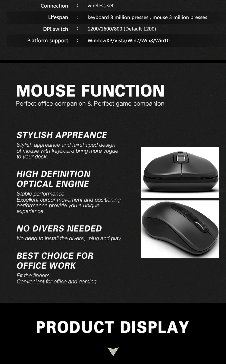 Характеристики продукта Метод подключения: 2,4G Размер клавиатуры: 450*165*26 ± 5 мм Размер мыши: 112*64,5*40 ± 5 мм Вес нетто клавиатуры: 480 г Вес нетто мыши: 65 г Размер упаковки: 550*196*45 ± 5 мм Вес брутто: 800 г Материал изделия: абс + ПК Дальность передачи: <= 10 м Батарея: 1 шт. AA (клавиатура), 1 шт. AA (мышь) Пробная система: MAC, Windows, Linux и т. Д. Беспроводная технология #2,4 ГГц обеспечивает надежное соединение с диапазоном до 10 м Без проводов сделать более умный и аккуратный рабочий стол. Унифицированный нано-приемник экономит драгоценные usb-порты компьютера # Очень resposive клавиши в ножничных клавишных переключателях Под углом наклона оказывать поддержку Шелковистые-гладкие шепот-тихие клавиши позволяют наслаждаться работой без беспокойства # Индикаторы низкого заряда батареи и мультимедийные горячие клавиши обеспечивают удобство Комплект тихих клавиатуры и мыши Мышь обеспечивает бесшумное нажатие; Никаких помех для вас и других Клавишные клавиши в низком профиле производят гораздо меньше шума при наборе текста