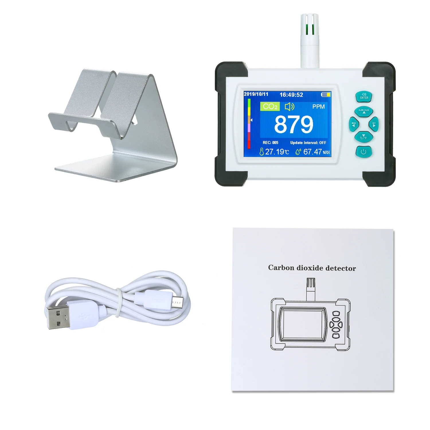 Детектор углекислого газа обнаруживает углекислый газ окружающей среды на месте через принцип поглощения источников инфракрасного светильник. Продукт имеет характеристики, температура, влажность, тенденция: 999 групп записи данных о погоде, 3,2 "TFT полноцветный светодиодный дисплей, задание сигналов тревоги, запись данных о временной интервал измерения, дата и время в режиме реального времени, заряжаемая литиевая батарея и т. Д.