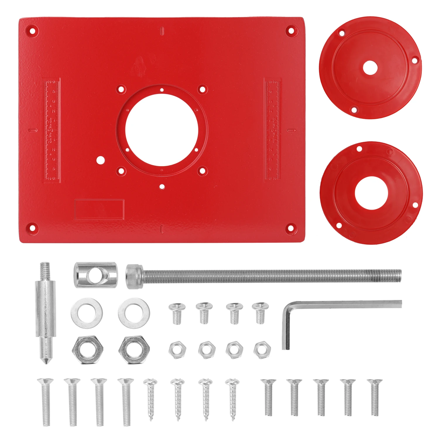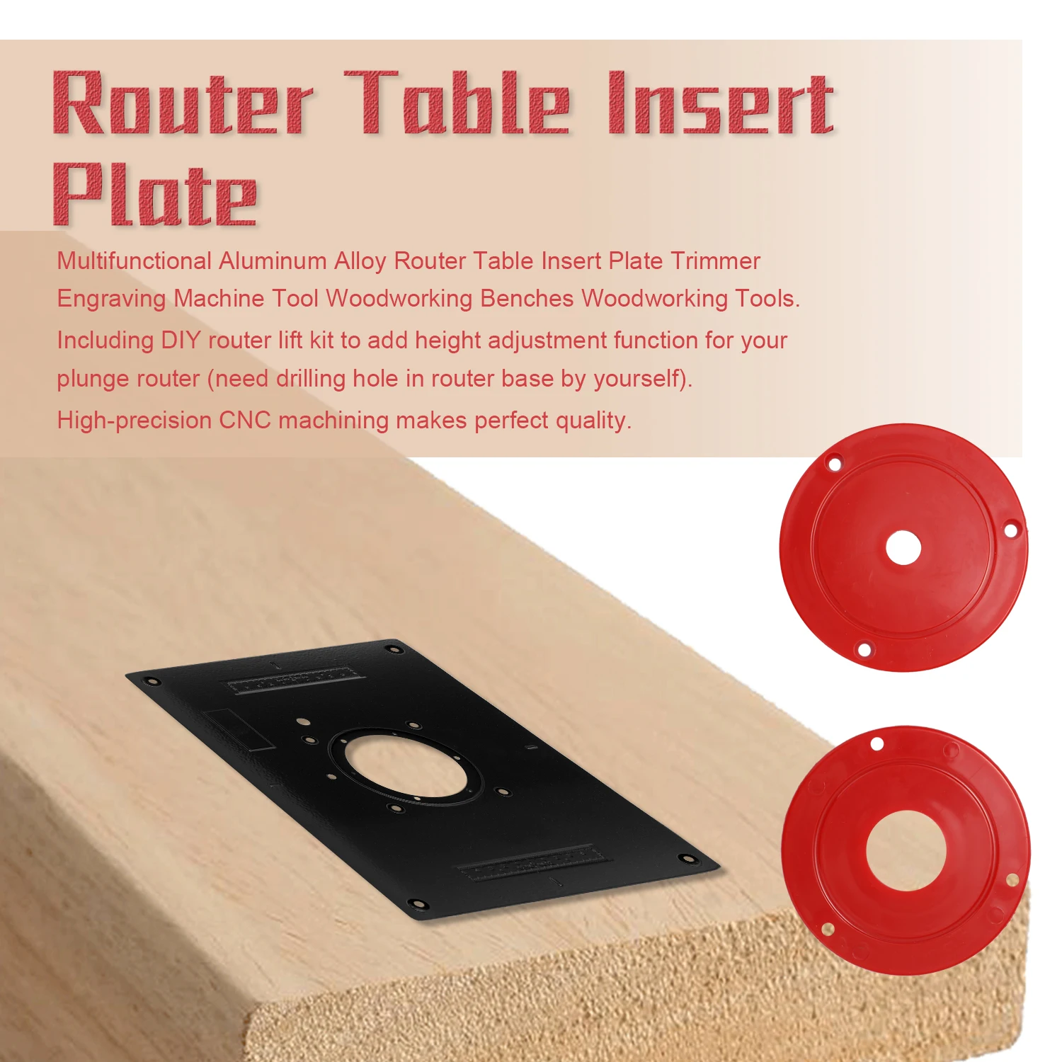В комплект входит подъемник для роутера «сделай сам», чтобы добавить функцию регулировки высоты для роутера (вам нужно просверлить отверстие в основании роутера самостоятельно). Многофункциональная вставная пластина с кольцами, подходящая для изготовления собственного фрезерного стола для высокоточной обработки дерева.