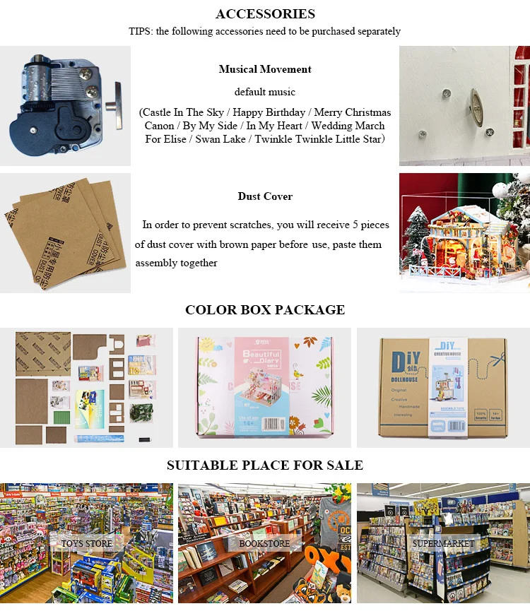 1. Возраст: подходит для детей старше 10 лет. 2. Клей/инструменты/батарея/Музыкальная Шкатулка/Пылезащитная крышка не включены в посылку. 3. Необходимые инструменты ручной работы: бумажные ножницы, нож, устройство для изготовления отверстий, точные пинцеты, отвертка.