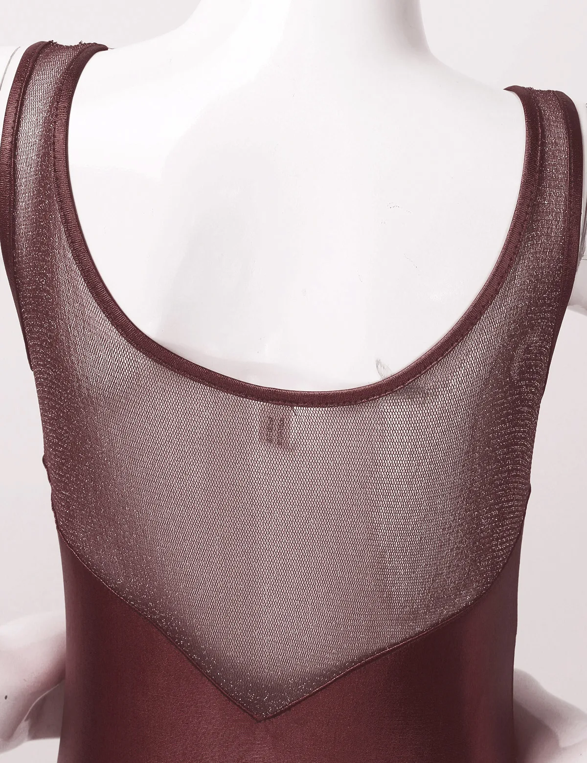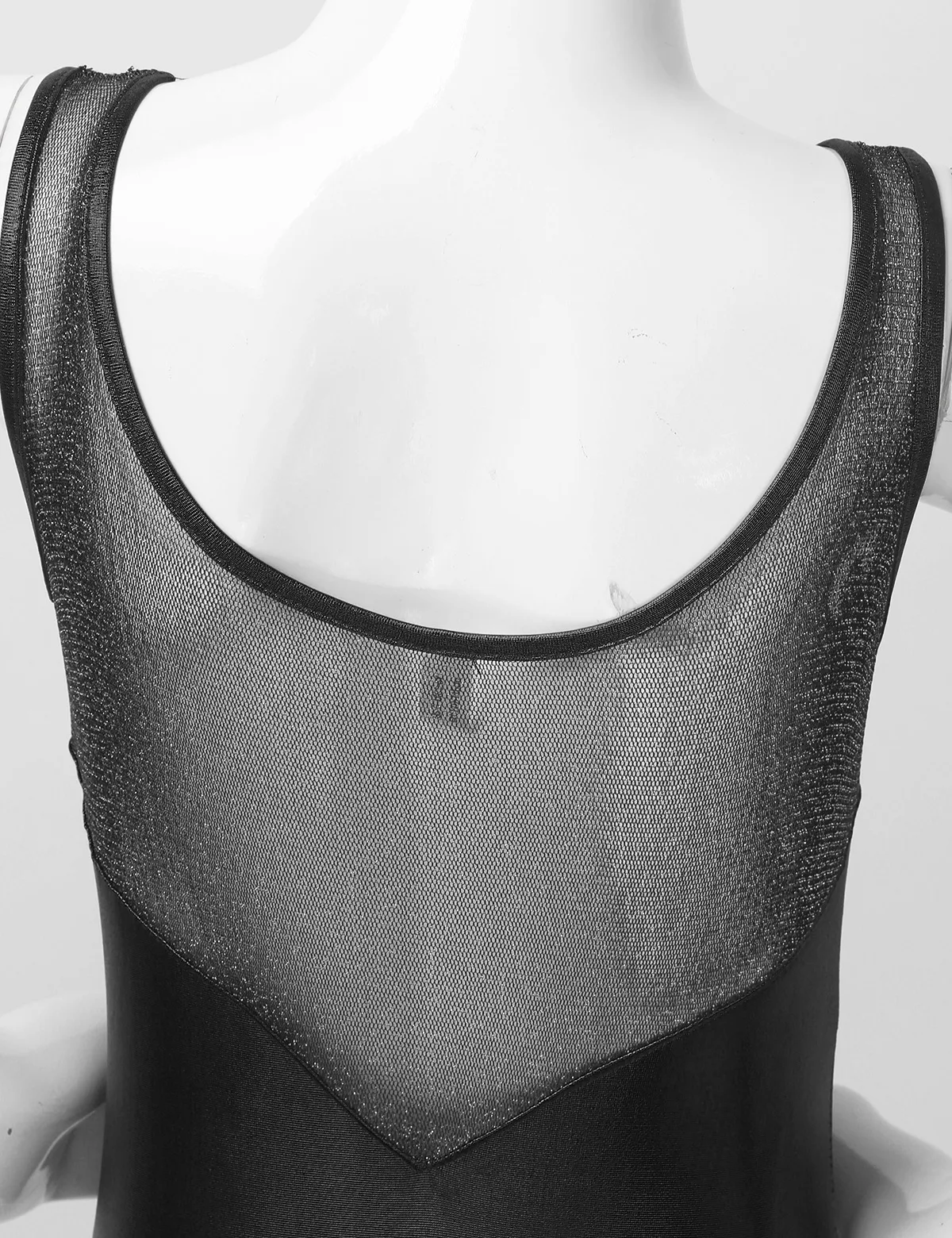 Без рукавов, с круглым вырезом, ассиметричный завиток из тюля спереди. Блестящий тюль сзади.