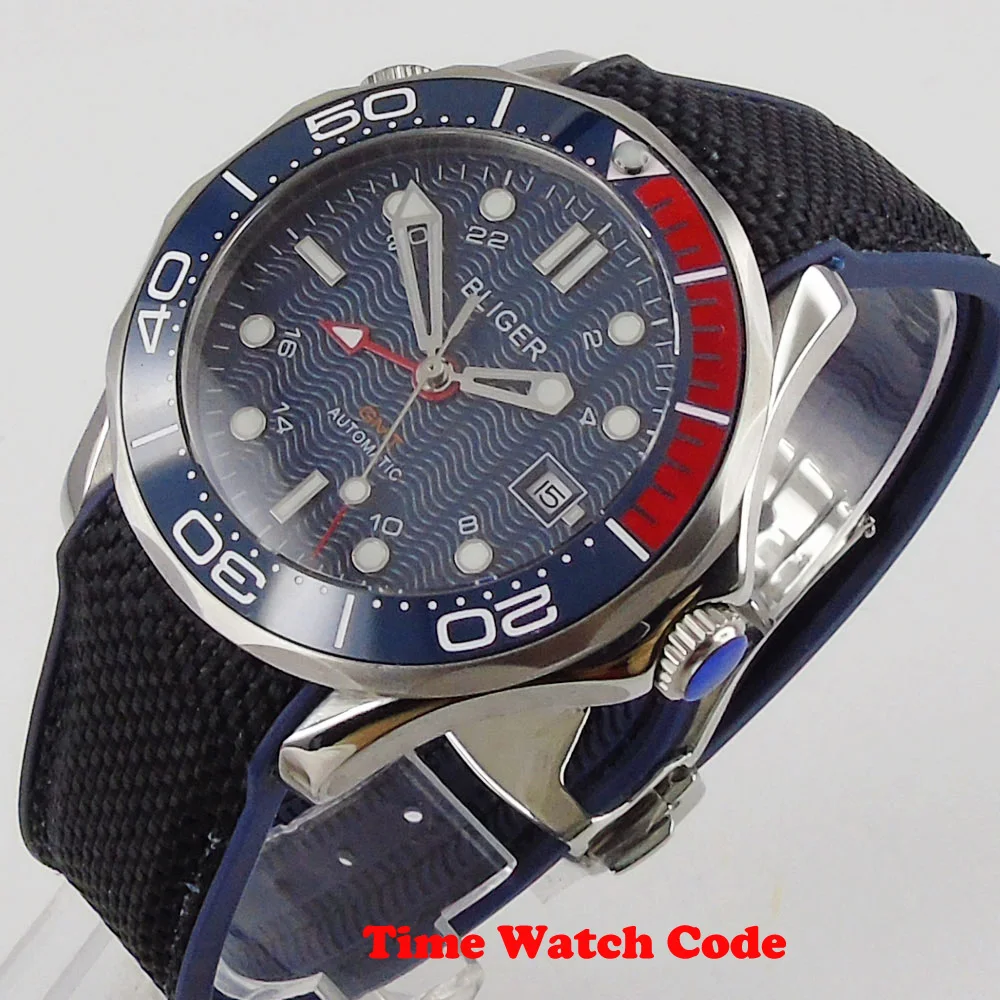 -- Механизм: механическое автоматическое движение -- Чехол Материал: 316L полностью нержавеющая сталь чехол с керамическим наконечником, ободок, с водонепроницаемым чехлом и возможностью погружения на глубину до 30 м -- Чехол Размер: 41 мм диаметр, 14,1 мм толщина -Циферблат: синий цвет, люминесцентные отметки и стрелки -Функция: окошко даты на 3'oclock postion -- Стекло: сапфировое стекло -Размер ремешка: ширина 20 мм -- Материал ремешка: резиновый ремешок -- Тип застежки: Пряжка