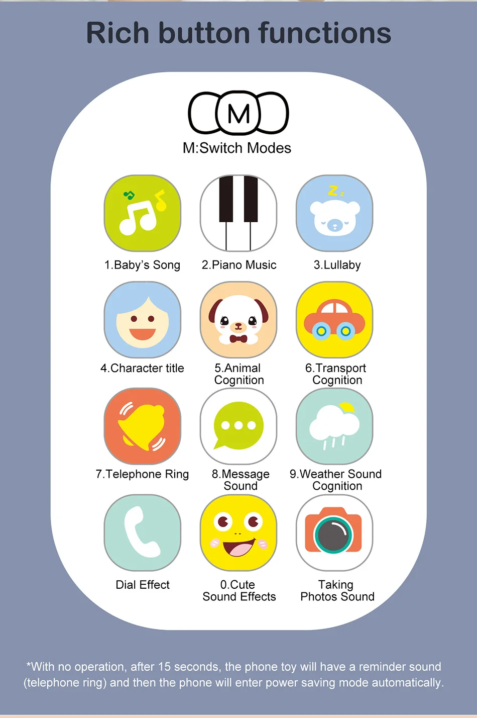 Детская песня/фортепианная музыка/Колыбельная Познание персонажа/познание животных/познание дорожного движения Телефонное кольцо/звук сообщения/звук погоды Sognition Эффект циферблата/милый звуковой эффект/фотографирование звука Без работы, через 15 секунд игрушка для телефона будет иметь звук напоминания (телефонное кольцо), а затем телефон автоматически войдет в режим энергосбережения.